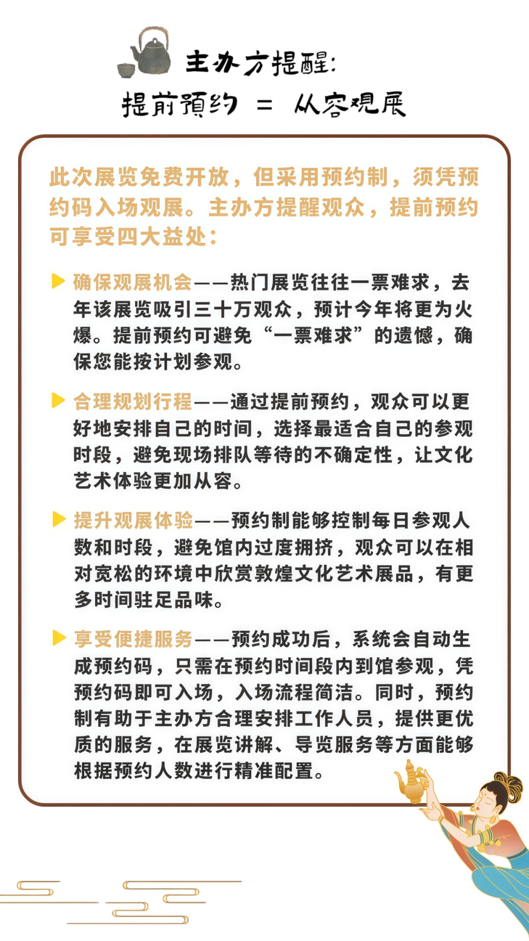 市文化旅游局介绍,2025年10月23日至2026年3月31日,“何以敦煌·念念回响”敦煌文化艺术公益展将在上海艺丰中心举办。此次展览对观众免费开放,采用预约制观展,预约系统已开启,预约通道一起往下看↓