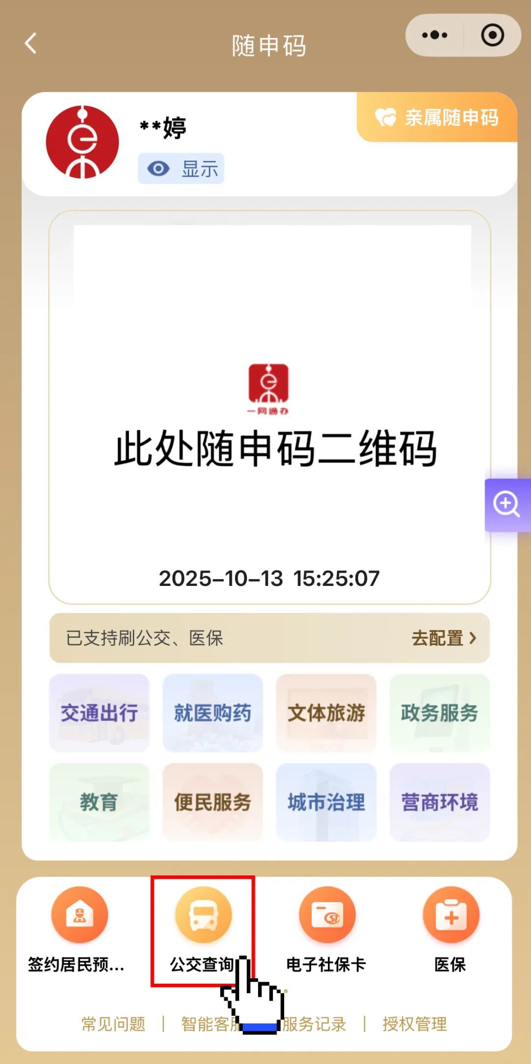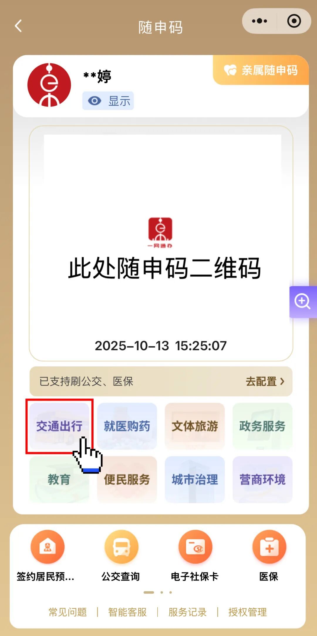 打开“随申办市民云”(APP/微信小程序/支付宝小程序),首页点击「随申码」,开通交通场景配置,完成签约,即可使用。