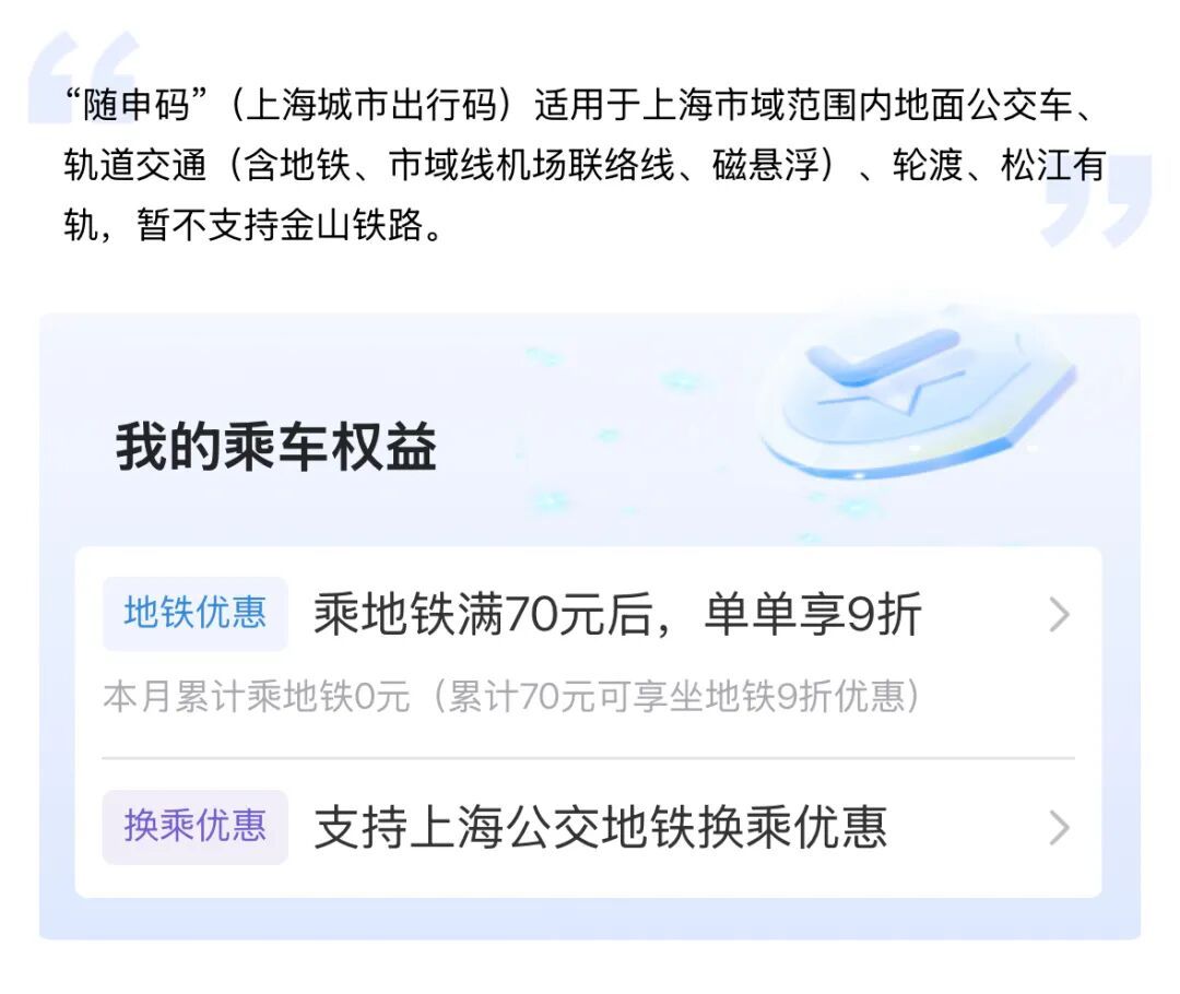此外,使用「随申码」乘坐地铁,当月累计消费满70元后,还可享受9折的额外优惠。