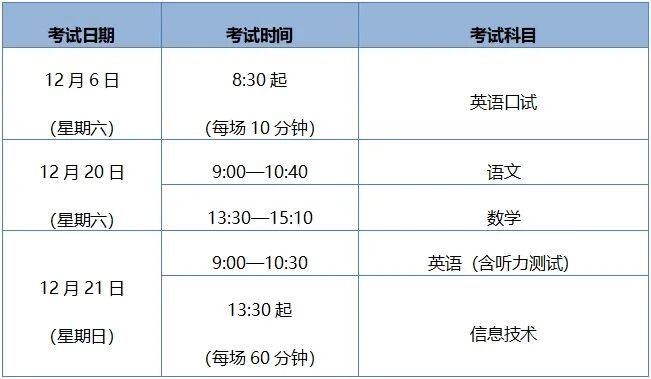 考试科目包括语文、数学、英语和信息技术。语文、数学科目采用笔试方式,时间均为100分钟。