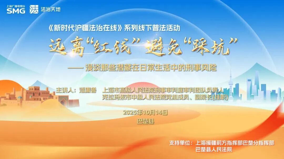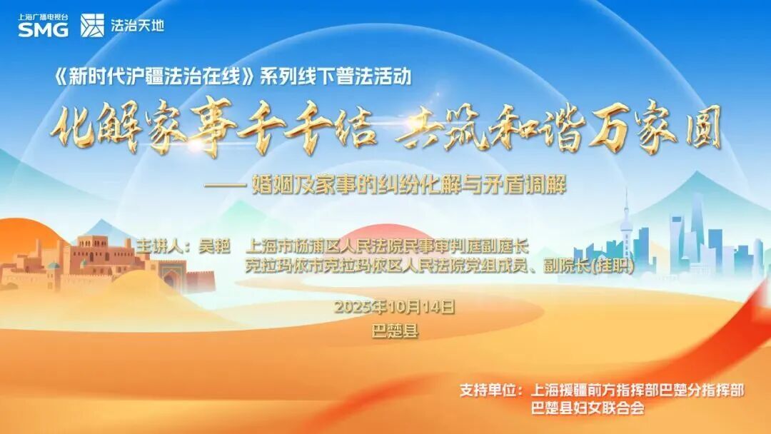 10月14号,在上海市委宣传部、上海市政府合作交流办的指导下,在上海市委政法委、上海援疆前方指挥部、上海市高级人民法院、喀什地区中级人民法院的大力支持下,上海广播电视台法治天地频道携手巴楚县人民法院、巴楚县妇女联合会,深入巴楚县当地社区,围绕日常生活中的刑事风险、婚姻及家事的矛盾调解等议题,组织开展了两场《新时代沪疆法治在线》线下普法活动。