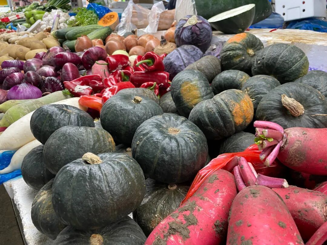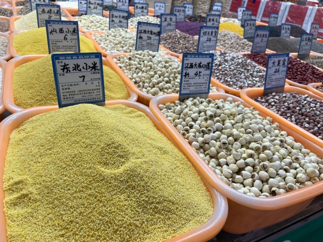 蔬菜区和干货区则弥漫着健脾养胃的“金黄暖意”。南瓜个个圆润饱满,小米金灿灿的,此时煲一碗小米南瓜粥最是养胃。