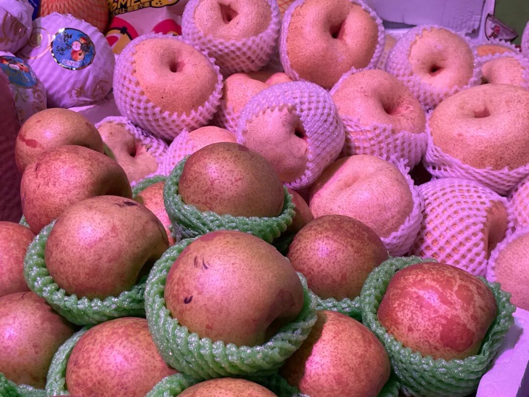 沿着蔬菜区往里走,水果摊上爽脆的梨同样诱人。白梨、庄行蜜梨、皇冠梨一一摆上了摊位。“一梨润三秋”,丰富的膳食纤维和维生素让一口梨具有润肠、润燥、清肺的作用。秋梨虽好,其性偏寒。摊主老板热情地介绍道:“最好拿回去煮一下,对肠胃虚弱的人更好。”记得保留梨皮发挥润肺止咳的功效。