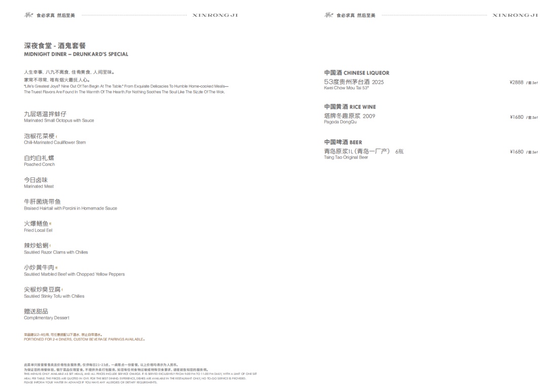 现在,新荣记特别为夜行动物门推出深夜食堂-酒鬼套餐,里面不仅有鲜到掉眉毛的东海三鲜烧年糕、渔家炊梭子蟹,还有和酒绝配的老鬼牛杂、尖椒咸鱼粒炒臭豆腐、湖南炒米粉等菜肴!(套餐啤酒、黄酒、葡萄酒可选)