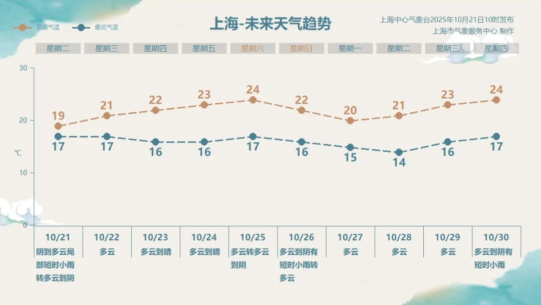 明天风力依然较大,天空状况转好,阳光上线,申城随即将迎来一段秋高气爽的天气。周四和周五天气会更为晴好,白天气温也将逐日上升,周六最高气温上升至24℃。需要注意早晚气温依旧较低,昼夜温差拉大,适时调整着装。周日前后受弱冷空气影响,云系增多伴有弱降水,气温再度下降。