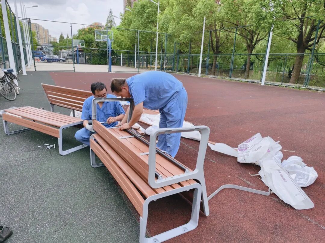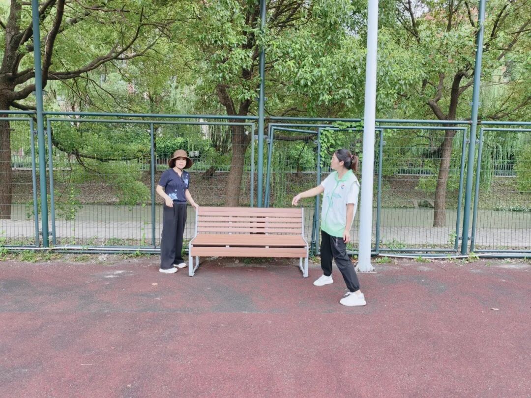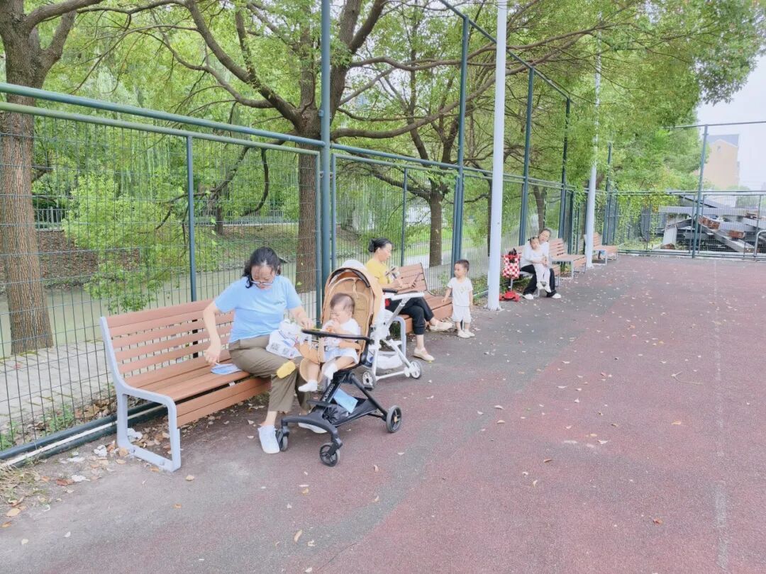宝山区杨行镇飘鹰锦和花园社区的排球场上,常常聚集着一群小孩和老人,这里临河而建,绿荫掩映,一直以来都是居民们“遛娃”、锻炼的热门去处。然而,居民们每日前来总需携带大包小包,还得自备小板凳,久而久之,也有了“抱怨”。