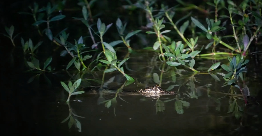 坐上小船驶入东滩保护区,夜色里只有水波声。“左手边!看亮晶晶的点!”东滩湿地公园扬子鳄科普宣教员张伟突然压低声音。海波顺着方向望去,水面上两个小亮点轻轻晃动——是扬子鳄的眼睛在反光!
