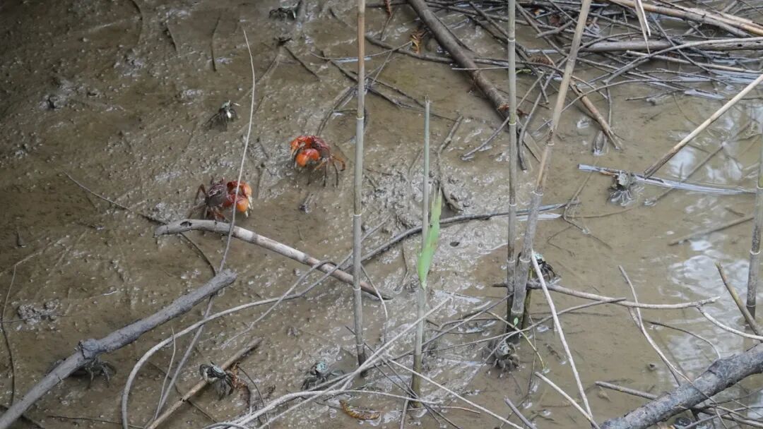 说着,陈宇雯突然指向栈道下:“快瞧!”几只拇指大的红螯相手蟹正横着钻进泥洞,“崇明话叫‘蛸蜞’,是湿地的小居民。”郭怡倩补充道,“这些小家伙就是最好的生态证明。”