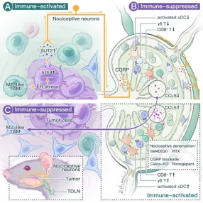 研究首次揭示了免疫压力下的肿瘤细胞,可“劫持”感觉神经远程抑制引流淋巴结(TDLN)中的系统性抗肿瘤免疫应答,从而实现免疫逃逸。阻断这种神经介导的肿瘤-TDLN通讯不仅显著增强免疫治疗疗效,也能显著抑制癌痛。研究不仅为理解神经调控肿瘤演进的作用提供了宏环境尺度的新视角,也为开发兼具抑瘤与镇痛作用的治疗新策略提供了理论依据与实验支持。