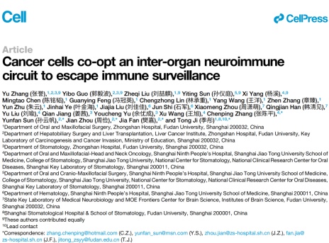 2025年10月24日,复旦大学附属中山医院樊嘉院士、季彤教授、周俭教授及孙云帆教授团队联合上海交通大学张陈平教授,在国际顶级期刊《Cell(细胞)》在线发表了题为Cancer cells co-opt an inter-organ neuroimmune circuit to escape immune surveillance(肿瘤细胞利用跨器官神经免疫轴逃避免疫监视)的研究成果。