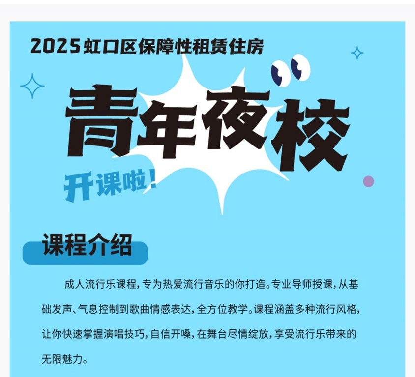 在永德居民区挂职、担任党总支书记助理的小黄,结束基层工作后,脚步匆匆走进青年夜校的声乐课堂。这位初来乍到的虹口区2024级选调生也是参与社区“寓委会”议事平台的住户代表。“住在保租房,是在虹口安了家;而做好社区的服务工作,就是把这个‘小家’融进社区的‘大家’里。”小黄笑着说,夜校不只是他业余生活的点缀,更是他融入社区、理解基层的小小窗口。音乐课堂里,他更真切地倾听青年租客们的真实心声,理解他们的需求与期待,也为他开展基层工作提供了丰富的实践视角和沟通桥梁。