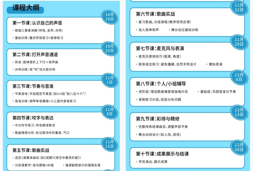 未来两个月的十节课里,张老师将带领学员们系统学习流行演唱的核心技巧,以歌曲实战打磨演唱细节,全方位掌握演唱技巧,深度感受流行乐的无限魅力。这场以音乐为媒的夜晚,悄然拉近了青年租户间的距离。