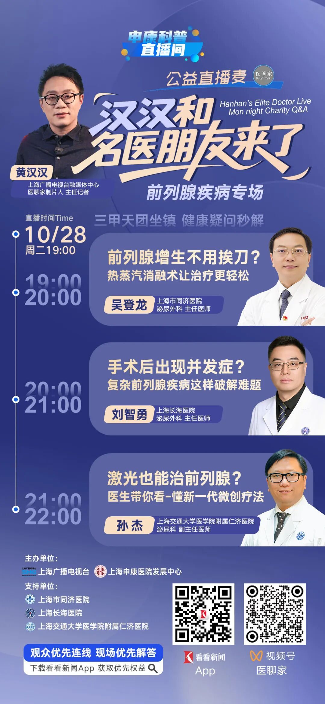 10月28日是世界男性健康日,同济大学附属同济医院党委副书记、泌尿外科学术带头人吴登龙教授将在明晚7点参加《申康科普直播间》,为广大市民和患者介绍如何走出误区、回归科学,正确认识前列腺疾病,为更多患者带来福音。 在男性健康问题中,前列腺疾病的发病率逐年上升,尤其是中老年群体。随着疾病进展前列腺增生、前列腺癌等问题不仅会导致排尿困难、反复感染,甚至影响肾功能和生活质量。手术作为前列腺疾病治疗的重要手段之一,技术正不断革新——从传统开放手术到微创乃至机器人辅助手术,安全性与精准度均有显著提升。因此,了解前列腺手术的适应症、术式选择、术后恢复与风险防控,对于广大男性群体和家属而言,具有重要意义。 《申康科普直播间》是由上海申康医院发展中心联合上海广播电视台《医聊家》栏目共同打造的一档全新网络科普节目,节目针对当前健康知识普及方面存在的问题,邀请来自市级医院的名医专家,围绕健康热点,与公众开展线上互动,进行权威健康科普。