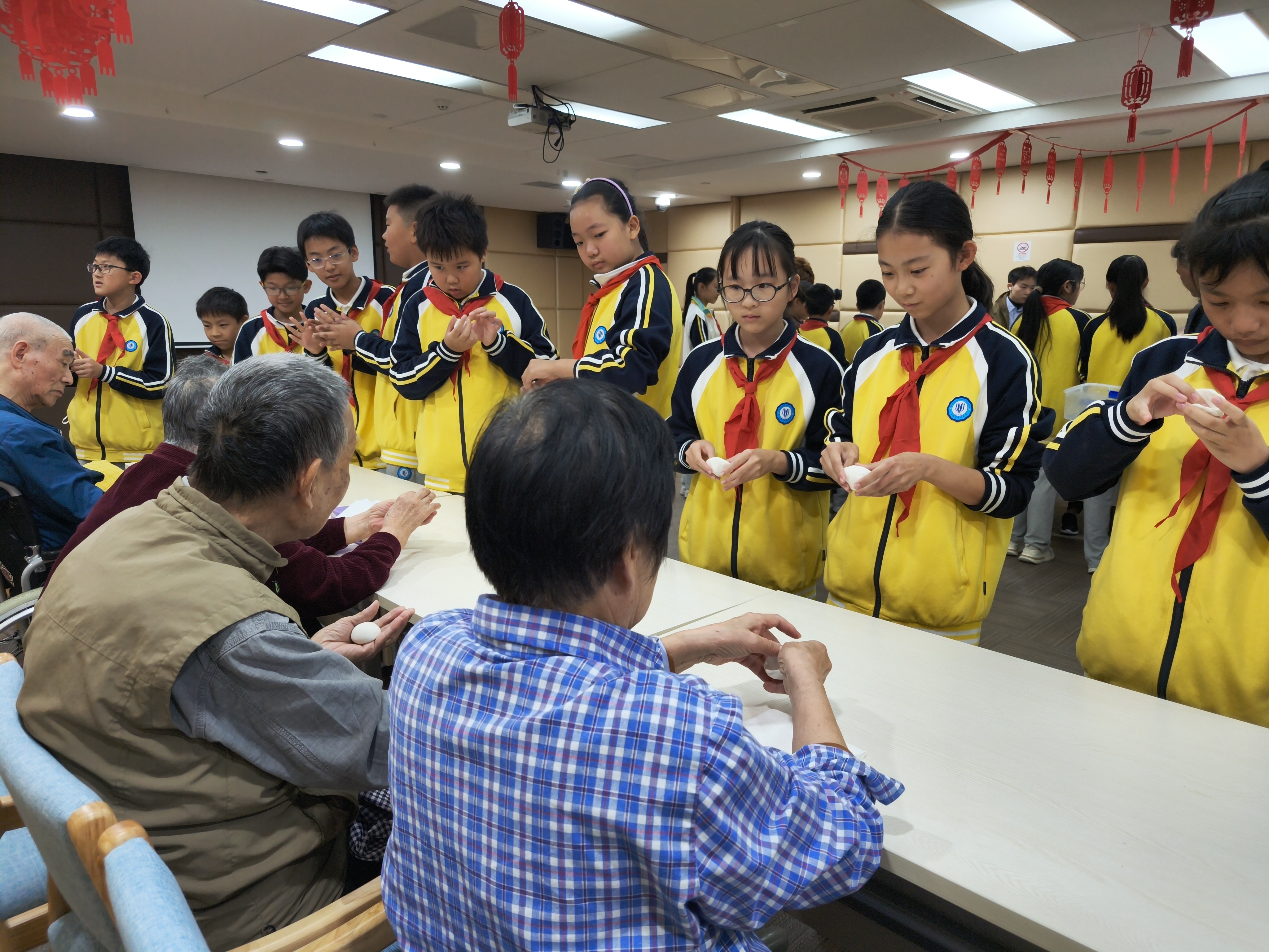 在包汤圆环节,学生们围坐在老人身边,向老人们请教包汤圆的技巧,老人们手把手地指导孩子们揉面、放馅、搓圆。一双双布满皱纹的手与一双双稚嫩的手相互配合,一个个圆润饱满的汤圆在欢声笑语中逐渐成型。一揉一搓间,不仅是汤圆的成型,更是敬老美德的代际传递。