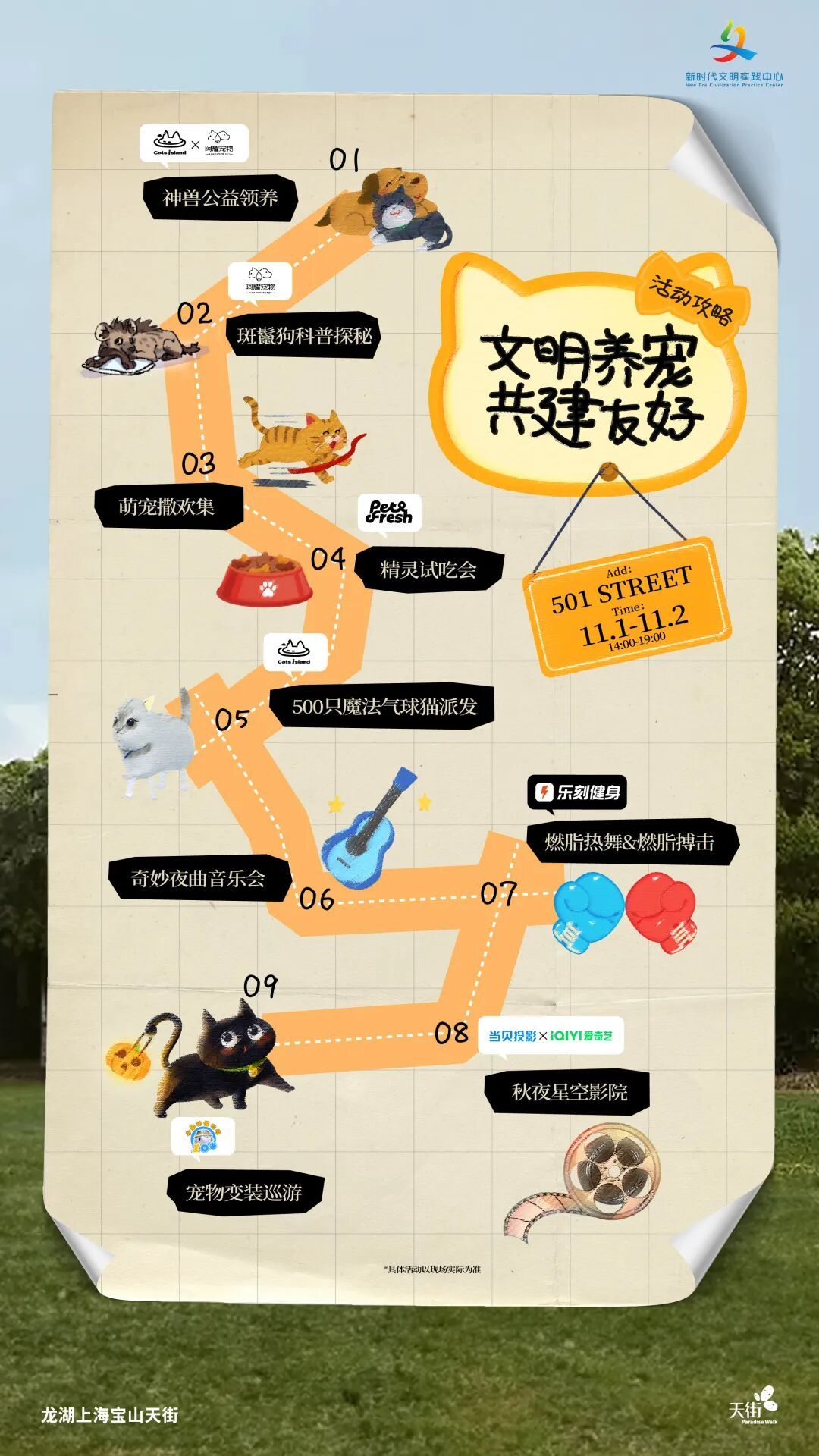 11月1日启动当天,现场准备了超多精彩活动!联手上海超人气IP猫岛和派特鲜生(Pet&Fresh),打造“萌宠撒欢集”——萌宠障碍赛、趣味迷宫等着你家宝贝来挑战!还有超贴心的露天影院,与爱奇艺、当贝投影合作,特设宠物休息区,让你和毛孩子一起看电影!中场还有趣味问答,在欢声笑语中get文明养宠小知识~