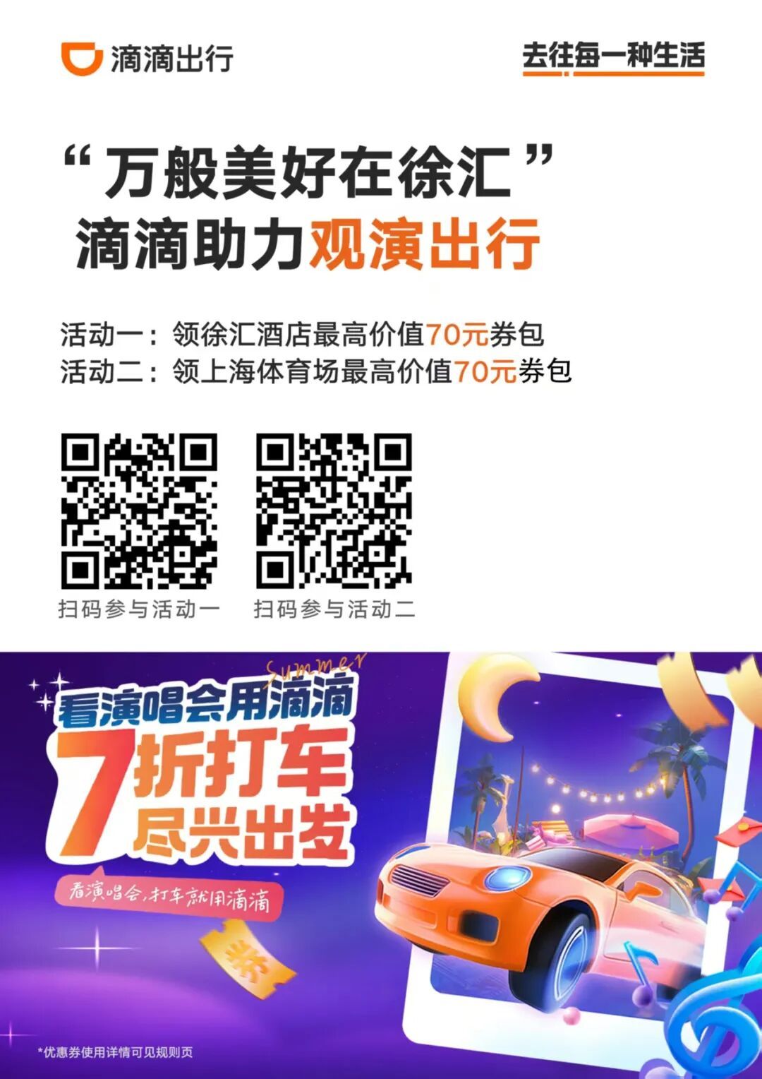 专属券包打车7折起!扫码参与图中活动,即可领取由滴滴出行观演专属券包。