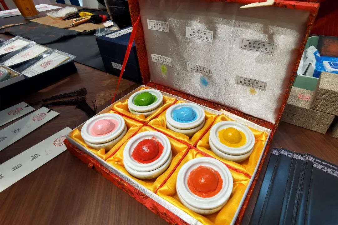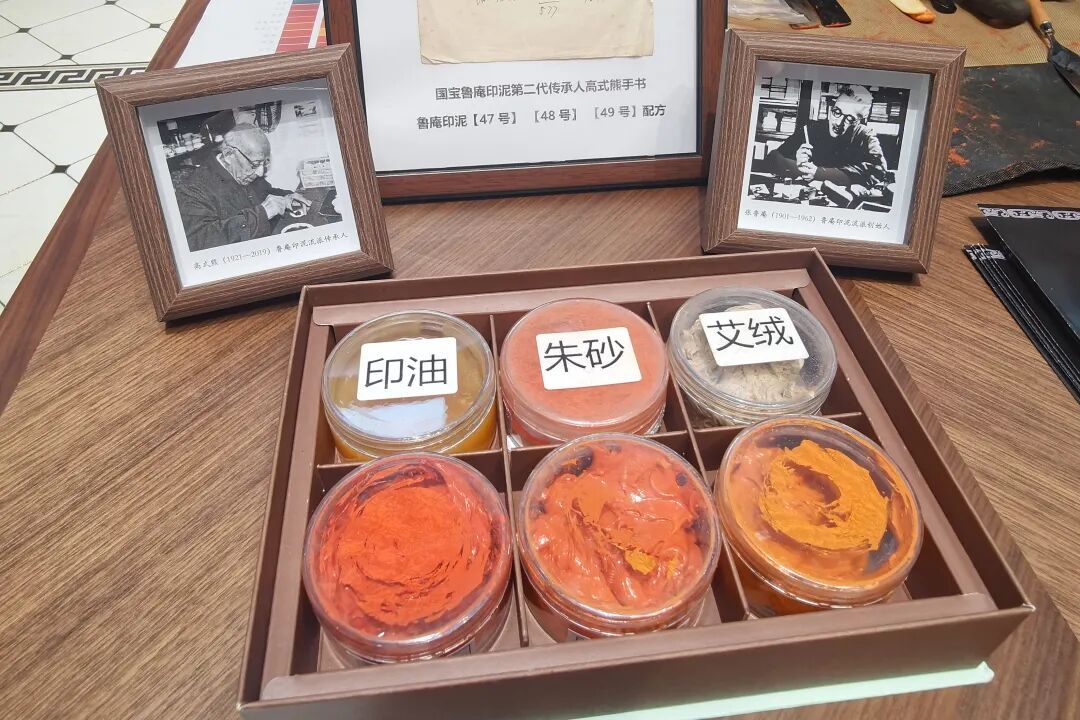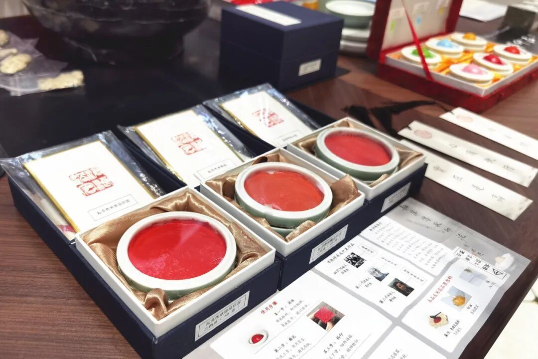 鲁庵印泥制作技艺区级代表性传承人田旭峰正一边指导体验者制作印泥,一边将印泥制作的要点娓娓道来。案桌上陈列的各式印泥更是让参观者对鲁庵印泥的制作流程和严谨的工艺要求有了更加深入的了解。