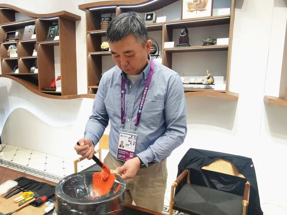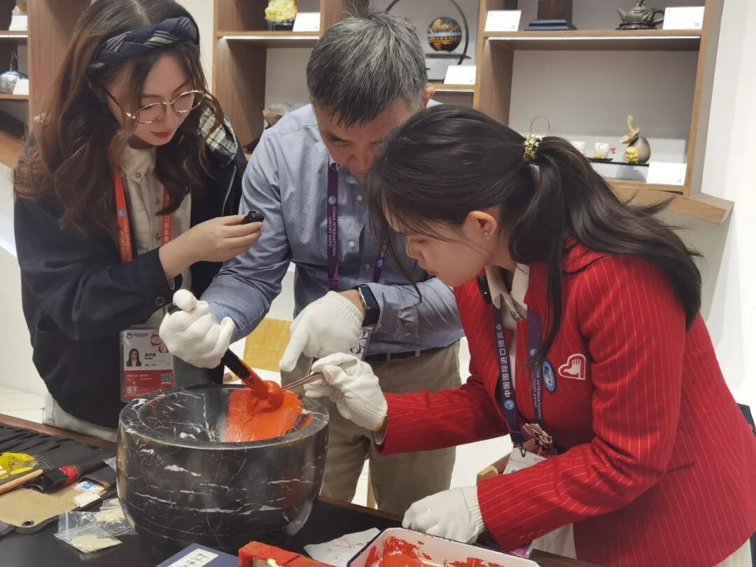 第八届中国国际进口博览会期间,位于新闻中心内的“上海非遗客厅”携多项沪上非遗项目开门迎客。11月6日,鲁庵印泥制作技艺开启“静安非遗会客厅”在“上海非遗客厅”的首秀。