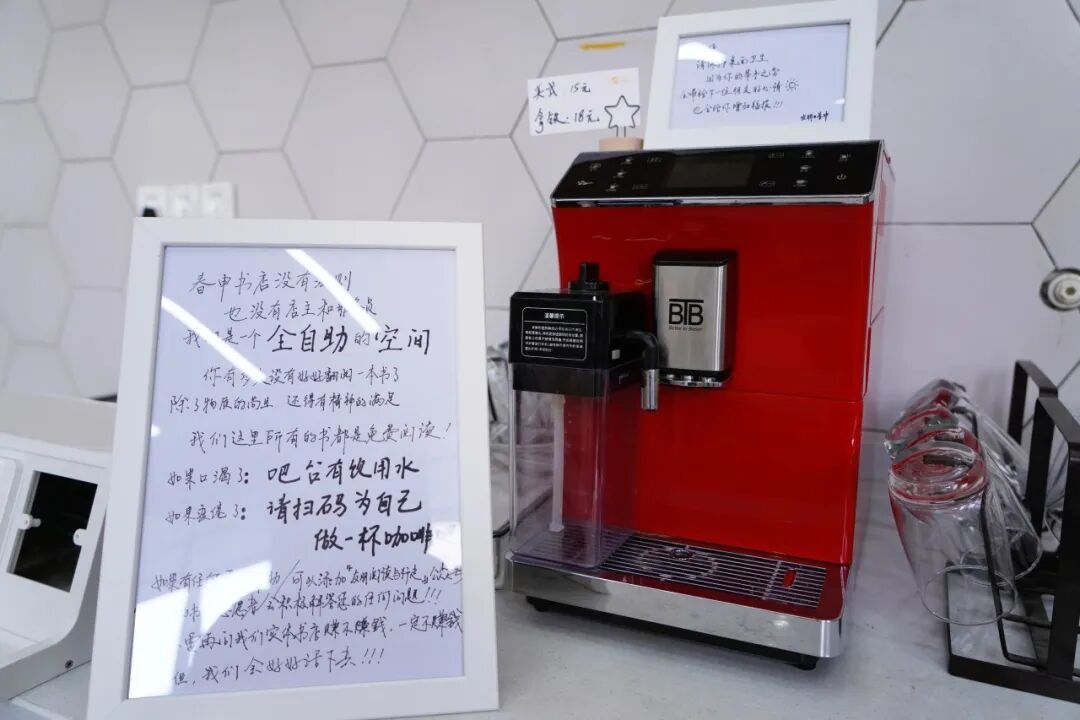 柔和的光线洒进屋内,志愿者吴雷振正在调试咖啡机,确认一切运转正常。这里没有店员,看书、购书、冲咖啡,全靠读者自助完成。