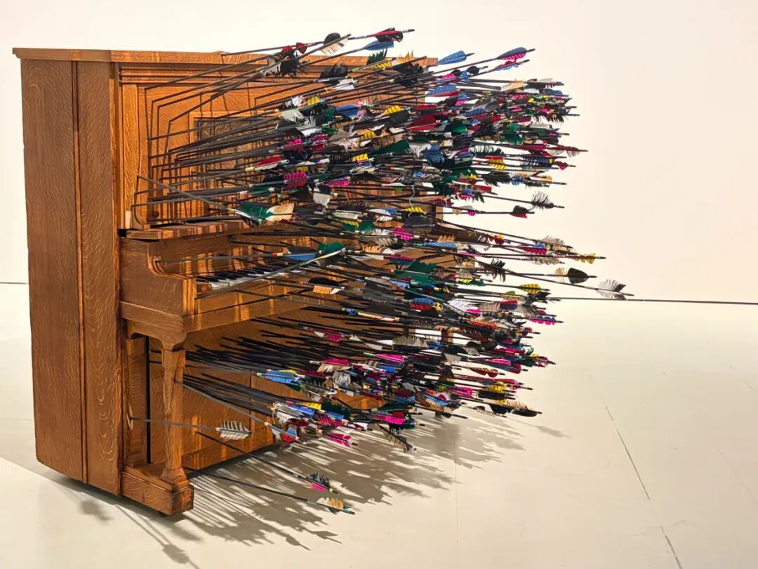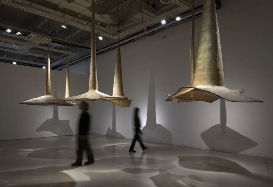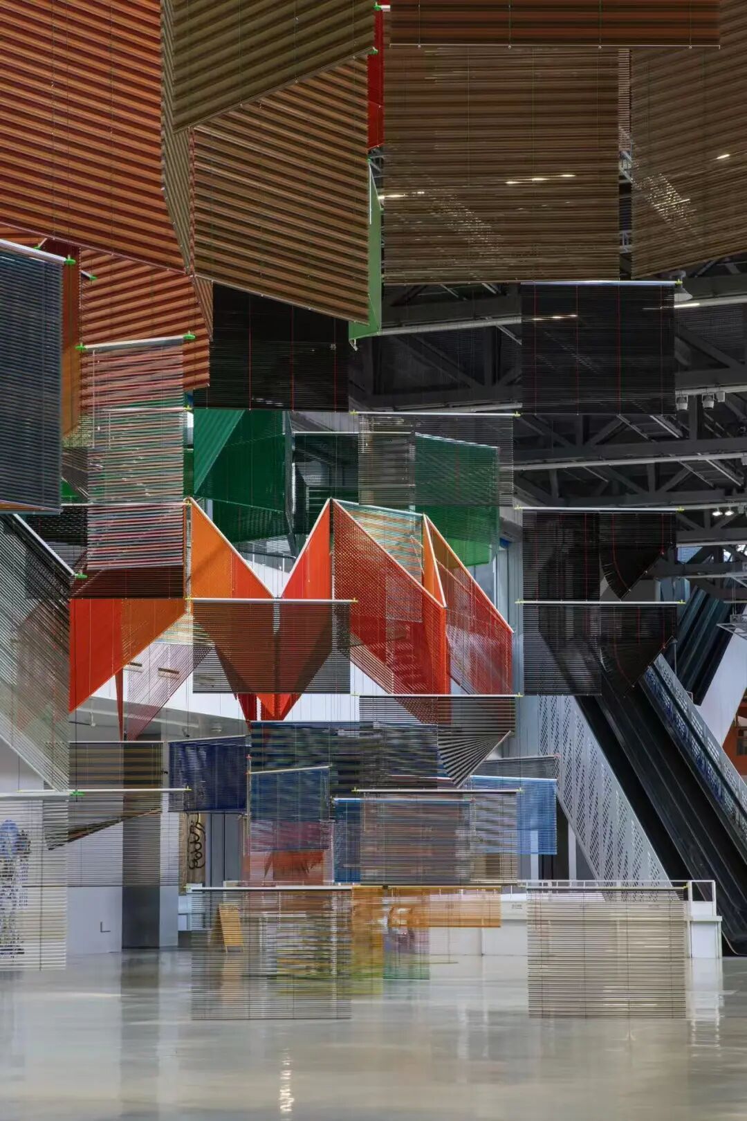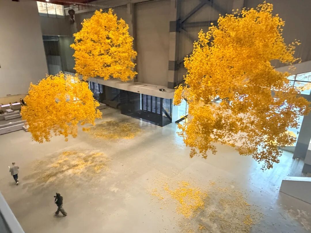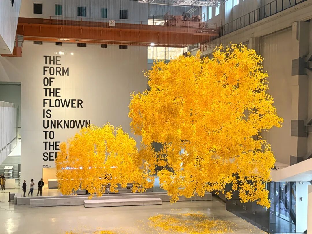 进入馆内,17万朵人造、可回收的黄花悬吊在空中、铺散在地面,这是今年专为上海当代艺术博物馆打造的作品《森之幻影》,取自黄花风铃木的意象。无根可依、无枝可栖的场景,如同一片森林留下的残迹。