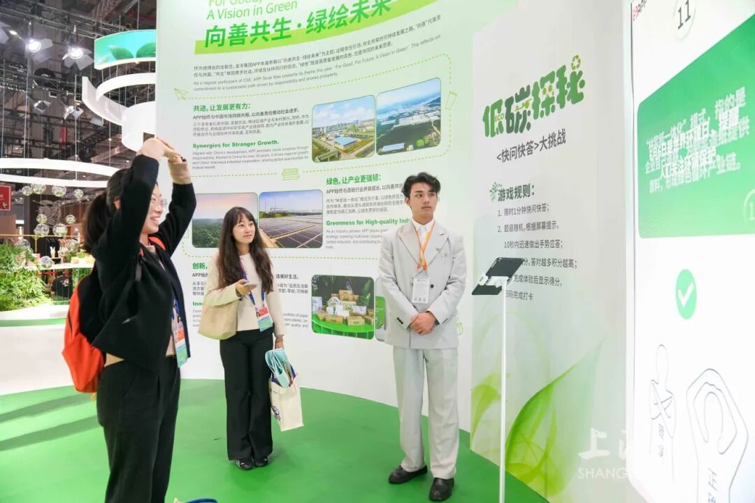 “我们希望用产品和技术,把绿色理念从生产链条一直延展到消费者的日常生活中。”APP展台工作人员说道。今年,APP把“向善”作为关键字,展示企业在推动产业升级、参与社会共建与倡导美好生活方面的实践成果。