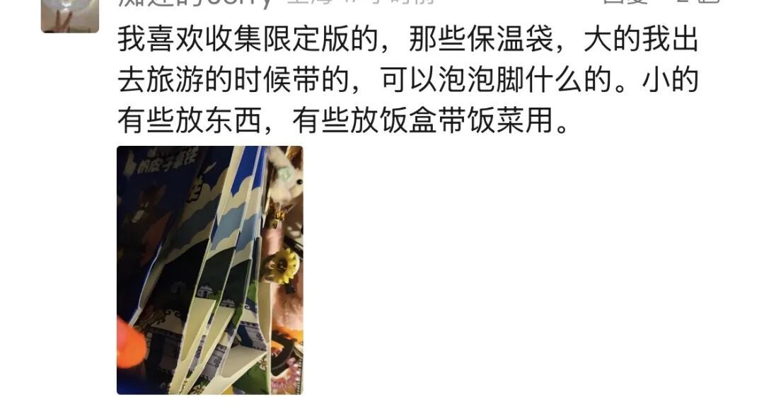 除了实用派用来做冰箱分格、野餐装备、收纳鞋包之外,不少人是冲着“限量”“联名”“绝版”而来。比如某茶饮品牌与动漫IP联名的杯套,二手价高达40元,依然有人买单。