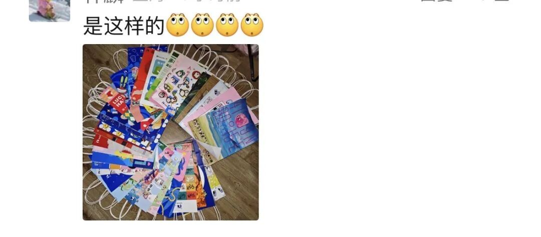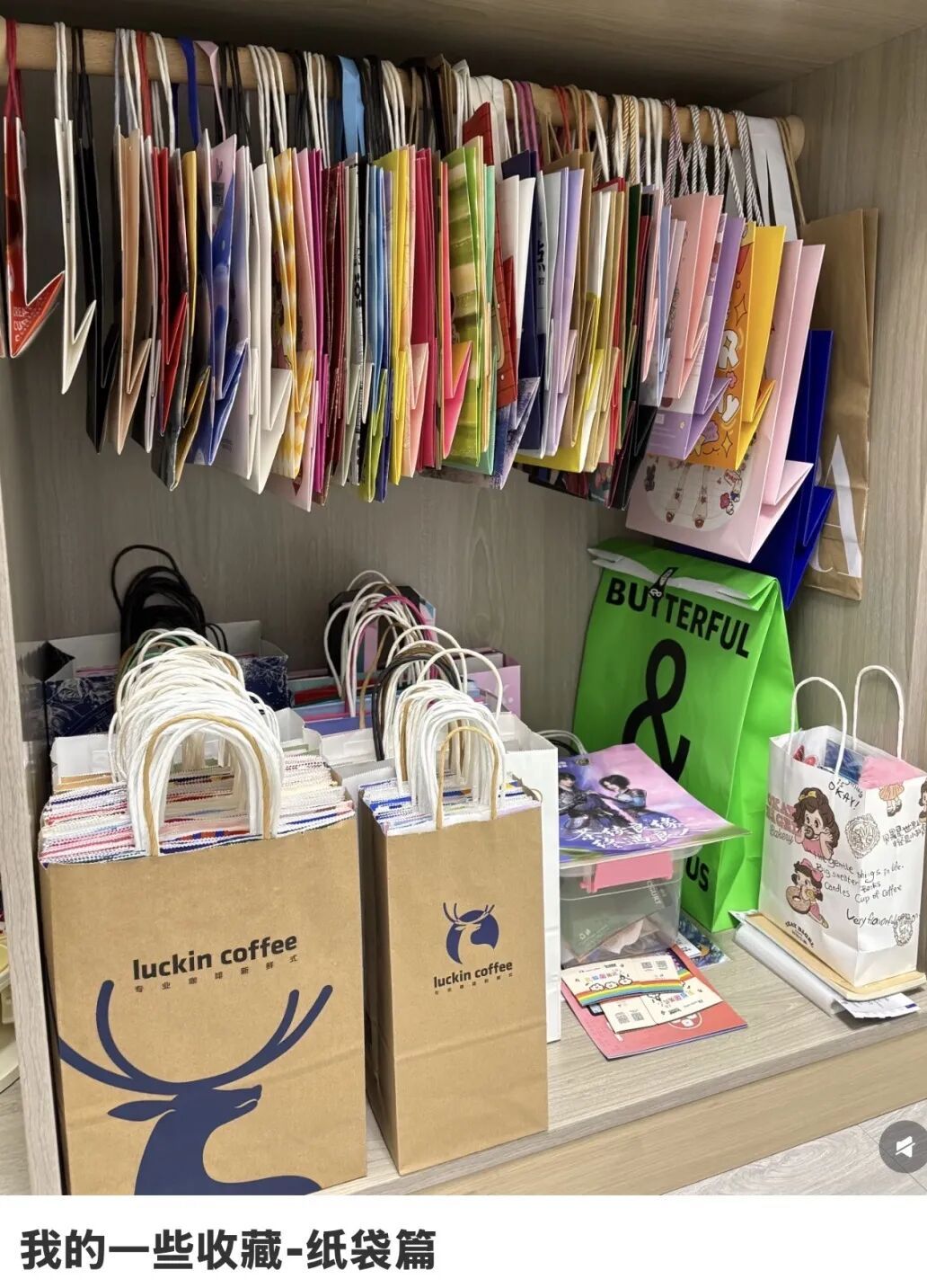 另一名受访者表示,重复的袋子,他会挂上网卖掉。普通袋子两三块一个,稀缺款能卖到15元甚至30多元。截至目前,他靠卖袋子赚了将近800元。“有些早期不火的品牌,后来突然火了,那些袋子就显得特别有意思,像品牌的‘成长史’。”
