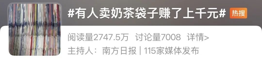 据媒体报道,在二手平台搜索“奶茶袋子”,即可看到大量卖家在出售各种奶茶包装,有卖家打出“59.9元得50个”的打包价,包含双杯袋、单杯袋等。