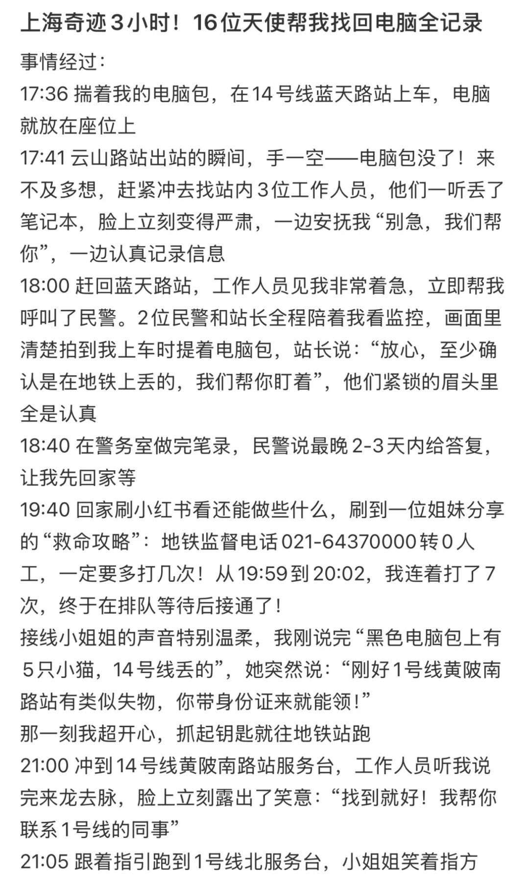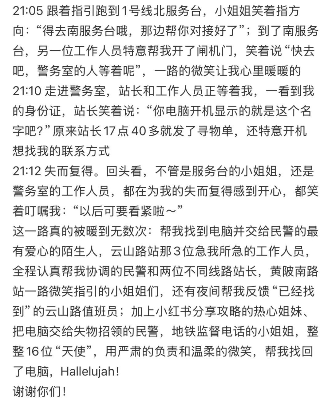 在此,上海地铁由衷感谢乘客在失物寻回过程中的暖心记录!我们为3小时内找回电脑的“奇迹”感到欣慰。这离不开云山路站、蓝天路站及黄陂南路站工作人员、民警及地铁服务热线的高效协同,这正是上海地铁全网大联动的生动展现。