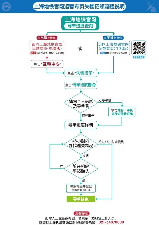 温馨提示:乘客在地铁遗失物品,可通过上海地铁官网“失物招领”平台自助挂失。系统将智能比对拾获物品,并通过微信/短信通知匹配结果。若匹配成功,可按指引至指定车站认领。同时,如您拨打服务热线人工坐席未接通时,可耐心等待一会,当空闲时排队系统会自动接入。需要说明的是,失物招领无法保证百分百寻回遗失物品,我们更诚挚提醒在出行时妥善保管随身物品,愿“天下无失”。