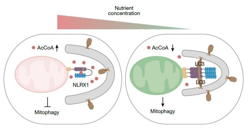 在营养充足时,高水平的乙酰辅酶A结合NLRX1的LRR结构域,增强其与NACHT的相互作用,从而掩蔽LIR基序,抑制线粒体自噬。而在饥饿条件下,乙酰辅酶A水平下降,其与NLRX1解离使LIR基序暴露,促进NLRX1寡聚化及与LC3结合,激活线粒体自噬。