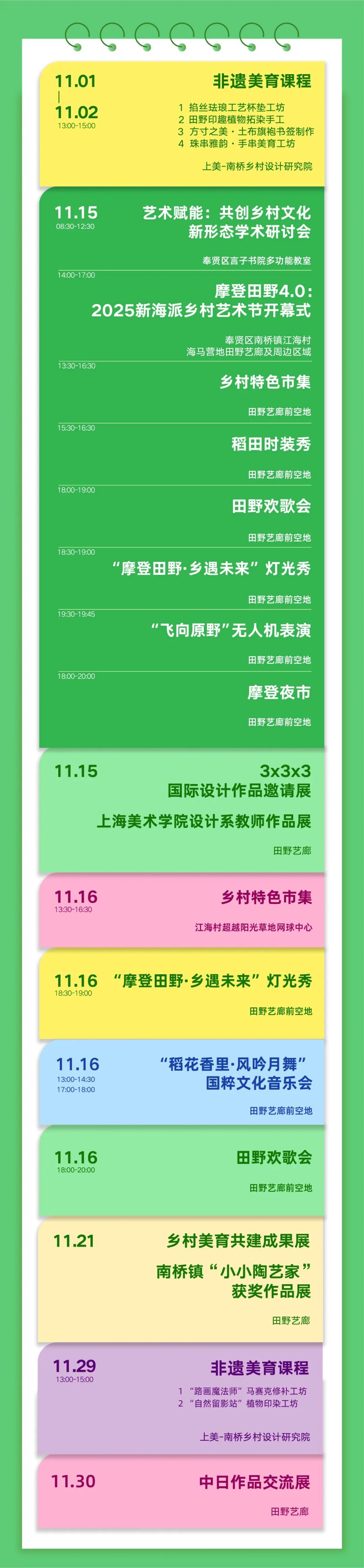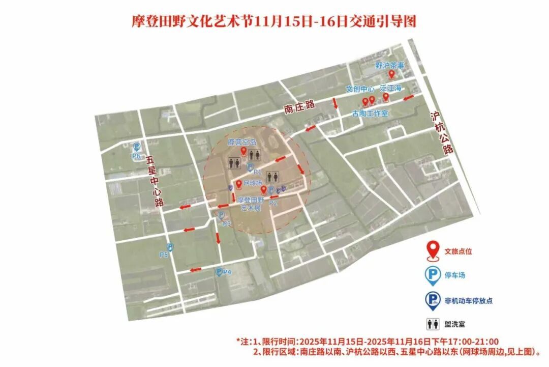 800架无人机惊艳南上海 国内外“十校十景”亮相乡村田野 酷炫灯光秀点亮摩登之夜 摩登田野2025SHOWTIME 你准备好了吗? 摩登田野作为上海大学上海美术学院联合奉贤区南桥镇共同打造的艺术赋能乡村振兴示范项目,四年来持续以艺术与设计为媒介,推动乡村更新与文化振兴。今年,摩登田野聚焦“艺术设计赋能乡村新质生产力”,围绕“共享、共生、共创”主题,续写田野新篇章! 1 活动亮点抢鲜看 本次“摩登田野2025新海派乡村艺术节”将于11月15日至12月15日在上海市奉贤区南桥镇南庄路沿线村庄举办。整个艺术节包含:国内外艺术设计作品展览、精彩的无人机表演、灯光秀表演,还有专家论坛、音乐会、文娱市集、美育课堂等丰富的文旅活动,邀请广大市民共享摩登盛宴。 “摩登田野2025新海派乡村艺术节”活动总览图 (点击图片查看大图) • 2 摩登南庄艺术作品导览 “摩登田野2025新海派乡村艺术节”作品导览图 (点击图片查看大图) 3 停车位指南 (点击图片查看大图) *现场停车位紧张,建议市民朋友们看准心仪活动时间,错峰出行。