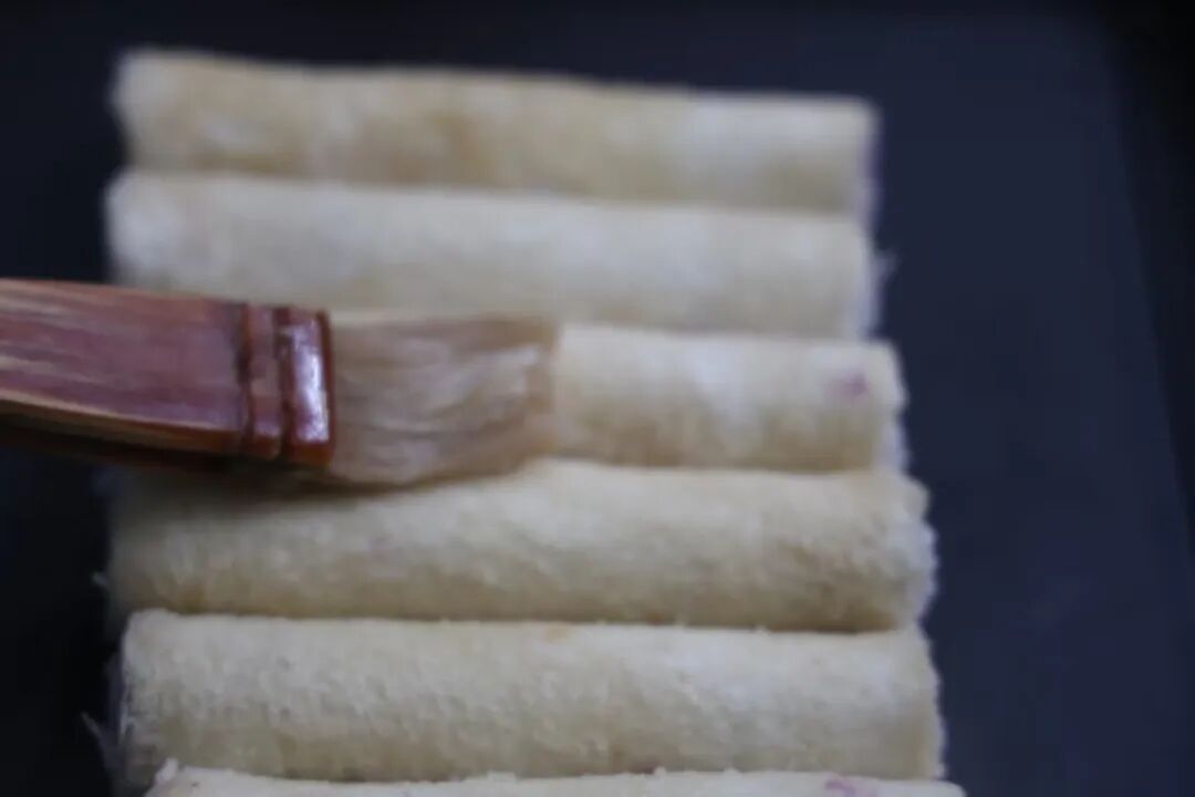 4.抹紫薯泥,均匀涂抹后卷起,刷上蜂蜜。