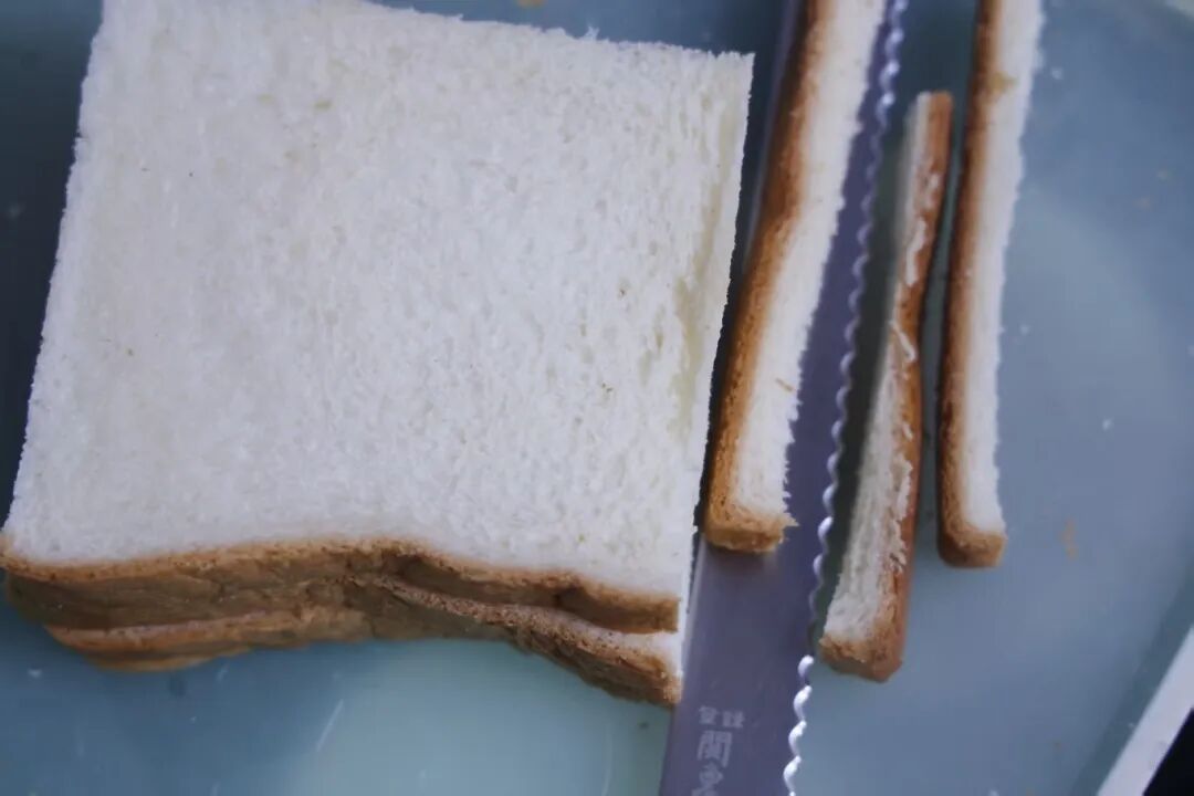 3.吐司切去四边,擀面杖擀薄。