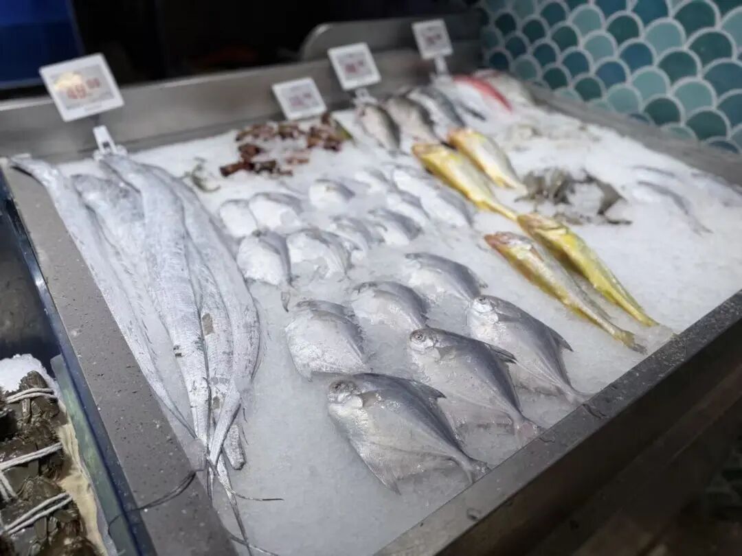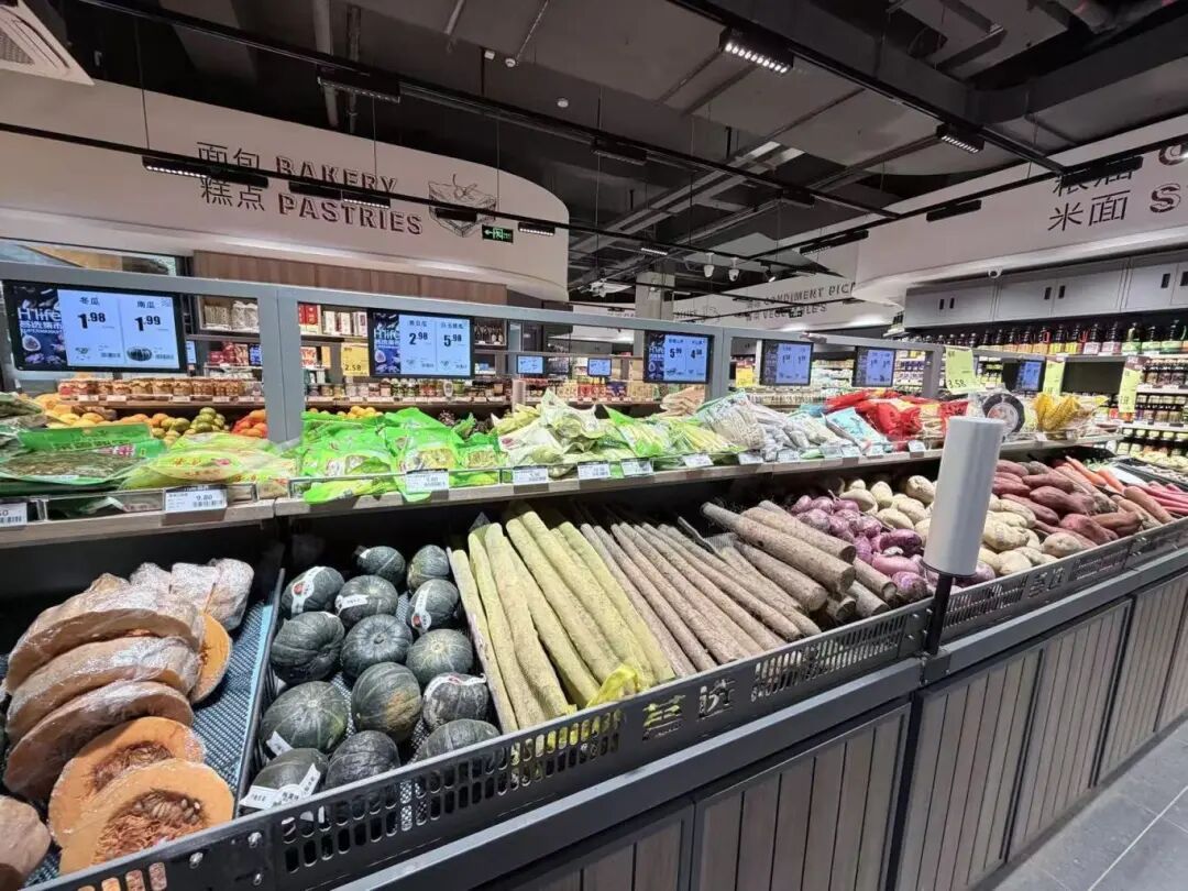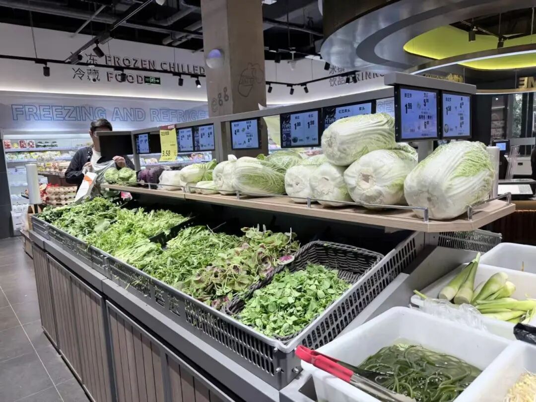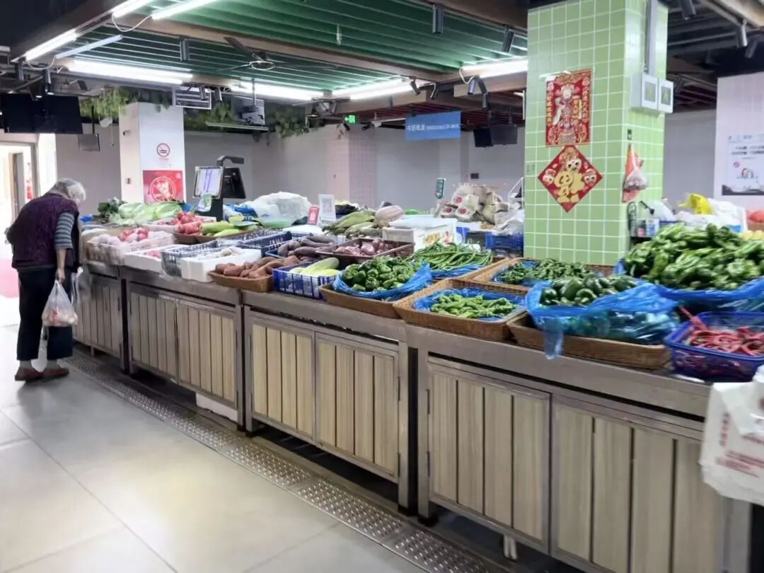记者实地看到,店内环境整洁明亮。蔬菜区内,苦瓜、丝瓜、西红柿、广东菜心、空心菜等时令蔬菜琳琅满目,品相新鲜。市民可自行挑选装袋后,前往统一柜台结算。海鲜档口更是种类丰富,大闸蟹、河虾、基围虾及各类贝类水产一应俱全,居民可在此完成日常食材采购。超市后方还设有常规百货区,满足一站式购物需求。