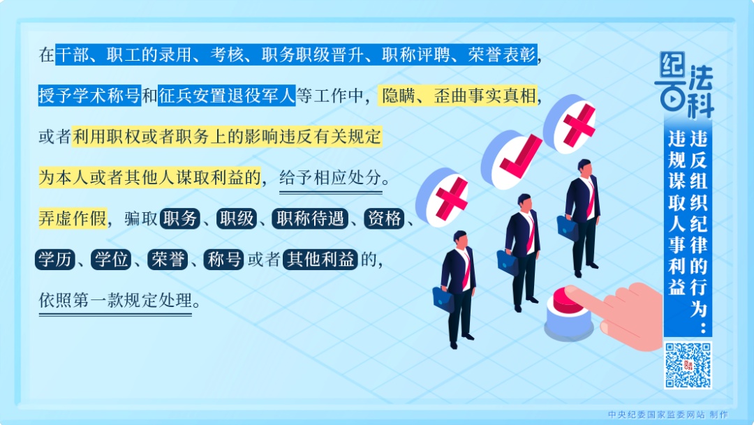 第一款规定,在干部、职工的录用、考核、职务职级晋升、职称评聘、荣誉表彰,授予学术称号和征兵安置退役军人等工作中,隐瞒、歪曲事实真相,或者利用职权或者职务上的影响违反有关规定为本人或者其他人谋取利益的,给予相应处分。