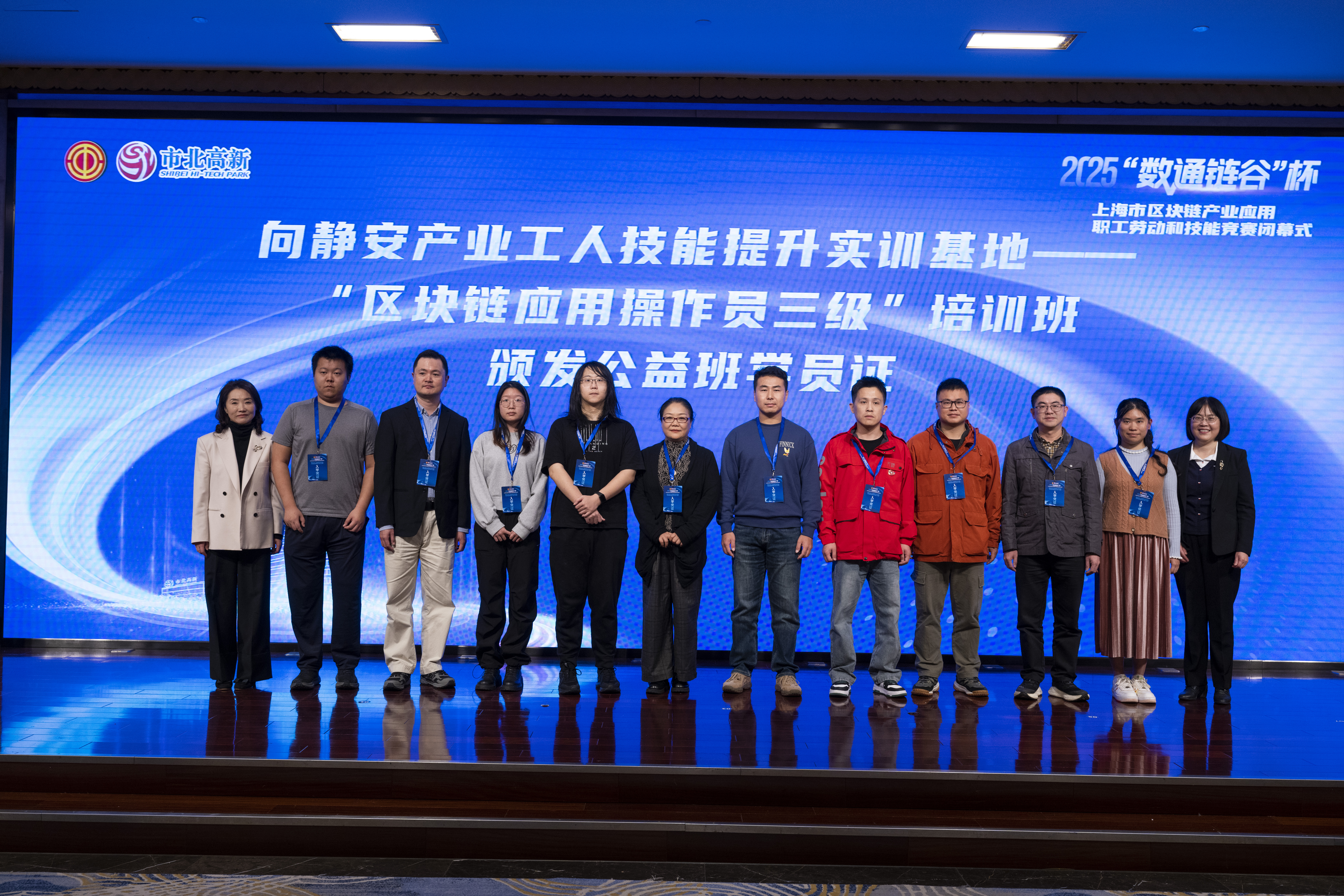 为推动“竞赛成果”向“产业人才”有效转化,区总工会、区人社局相关负责人共同为“静安产业工人技能提升实训基地——‘区块链应用操作员’培训班”学员代表颁发证书,强化人才链与创新链的双向赋能。