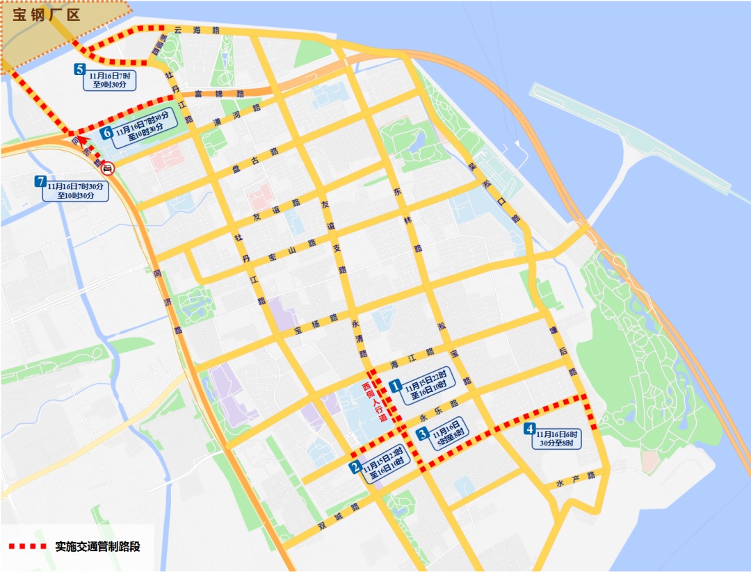 亲爱的市民朋友们: 2025上海长滩半程马拉松将于11月16日(周日)在宝山滨江热血开跑。跑者们用脚步丈量城市的热情,而我们作为“最佳应援团”,也要用文明为赛事加分!这份超实用观赛指南,助你成为最酷“氛围组”! 做善意传递的“宝山迎宾人” 让我们以开阔胸襟和真诚笑容迎接八方来客,主动微笑回应问询。酒店、餐饮、交通等行业请做到明码标价、诚信待客,让“宝山温度”融入每次的贴心服务。 做规范自身的“赛场守护者” 赛事期间,请服从现场引导、有序观赛,不拥挤、不横穿赛道,不擅自向选手递送物品,共同维护镜头里宝山的自在与有序,展示我们文明有礼的城市风貌。 做文明助威的“气氛制造机” 请注意避免使用汽笛、喇叭等高噪声音响设备。当选手经过时,可用整齐响亮的口号或鼓掌助威,但勿随意投掷彩带、纸花等物品。平等鼓励所有跑者,冲刺阶段更需热烈欢呼传递支持。 做维护环境的“环保卫士” 请将垃圾投入分类垃圾桶或暂存随身垃圾袋中。避免携带易泼洒食物,主动拾捡零散垃圾,用举手之劳守护赛道的整洁美观,让奔跑的身影与洁净的城市景观相得益彰。 做错峰出行的“时间管理者” 请提前了解交通管控信息,合理规划出行路线。在赛事结束后按志愿者指引分批离开,避免在出口处聚集。若遇道路拥堵,请多份耐心、多些礼让,用行动诠释文明素养。 你我的一言一行,恰是这座城市最动人的风景线。让我们以这场马拉松为契机,用文明为赛事添彩,用热情为跑者加油,让“全国文明城区”的金字招牌因你我而更加闪亮! 宝山区精神文明建设办公室 2025上海长滩半程马拉松 交通管制通告 2025上海长滩半程马拉松将于11月16日(周日)7时在宝山区举行。为确保赛事安全、顺利举办,根据《中华人民共和国道路交通安全法》的有关规定,上海市公安局宝山分局决定对宝山区部分道路采取交通管制措施,现通告如下: 一、赛事线路 宝山体育中心(起点)—永清路—双城路—塘后路—吴淞炮台湾公园—零点支路—吴淞口国际邮轮港—宝山滨江段(含长滩段)—云海路—牡丹江路—宝钢厂区—同济路—富锦路—宝钢体育中心(终点)。 二、交通管制时段、路段 (一)11月15日22时至16日10时,永清路(海江路—永乐路)禁止车辆通行,道路西侧人行道禁止行人通行。 (二)11月15日22时至16日10时,永乐路(牡丹江路—永清路)禁止车辆、行人通行。 (三)11月16日5时至8时,永清路(永乐路—双城路)禁止车辆通行。 (四)11月16日6时30分至8时,双城路(永清路—塘后路)、塘后路(双城路—吴淞炮台湾公园)禁止车辆通行。 (五)11月16日7时至9时30分,云海路(牡丹江路—帆顺路)、牡丹江路(帆顺路—宝钢厂区)禁止车辆通行。 (六)11月16日7时30分至10时30分,同济路(宝钢厂区—富锦路)、富锦路(同济路—牡丹江路)禁止车辆通行。 (七)11月16日7时30分至10时30分,同济高架路(南向北)富锦路下匝道禁止车辆通行。 三、交通管制措施 (一)机动车:实施交通管制的道路,双向禁止机动车通行。 (二)非机动车:设置有机非隔离设施的道路,非机动车应靠右缓行或在人行道上推行(部分道路禁止非机动车同向通行);无机非隔离设施的道路,禁止非机动车通行。 (三)行人:需绕道通行。 (四)在有通行条件的情况下,在现场民警指挥下,至指定路口允许非机动车及行人间歇式横穿赛事线路。 (五)警车、消防车、救护车、工程救险车执行紧急任务及持有半程马拉松比赛车辆通行证的车辆准许进入上述交通管制道路。 警方提示 上海市公安局宝山分局将根据安保工作实际,视情提前或推迟交通管制时间,扩大或缩小交通管制范围。敬请广大市民做好出行安排,积极配合公安部门工作。