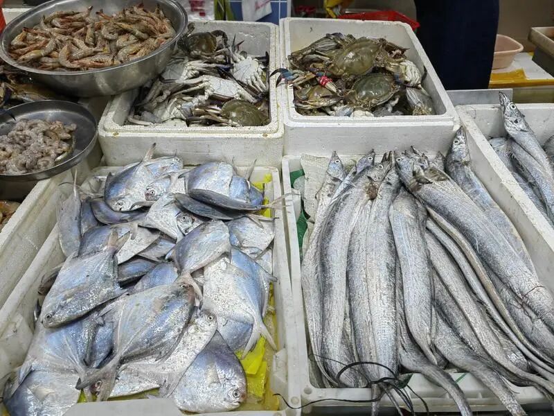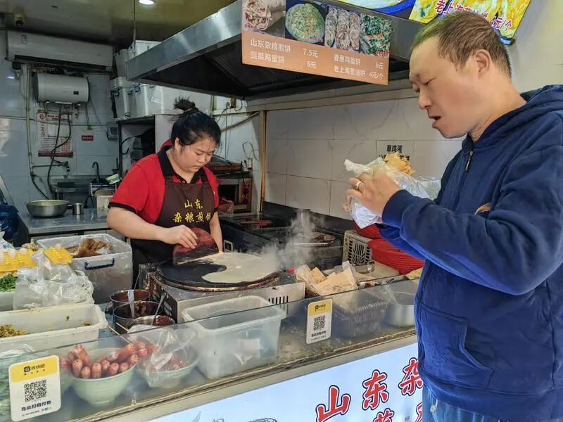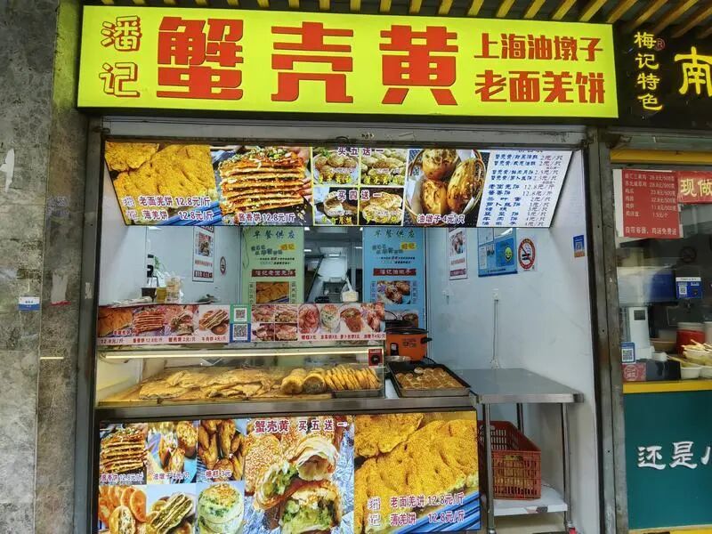 值得一提的是,本次改造的另一个特色,就是增加了烟火气美食的区域。在菜场门口可以看到,无论是早餐的“四大金刚”、煎饼、汤包,或是晚餐的油炸爆鱼、卤牛肉、手工肉丸、三文鱼等,都一应俱全。