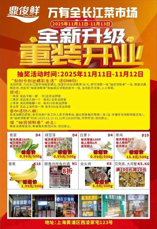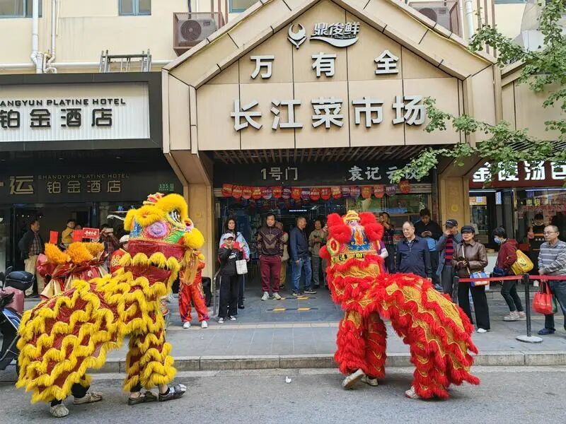 有“小金陵路”之称的西凌家宅路热闹非凡。随着锣鼓喧天、金狮舞动,经过一个半月的改造升级,鼎俊鲜万有全长江菜市场焕新归来,为这条南洋风情小马路再添浓浓烟火气。