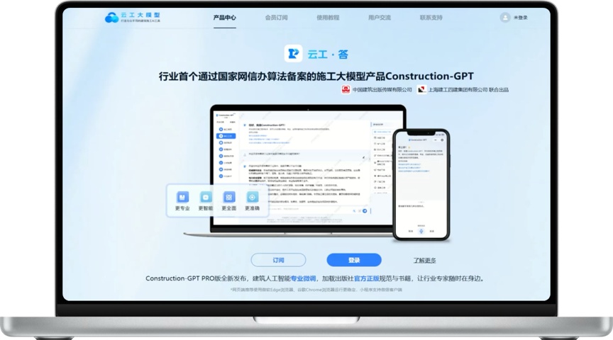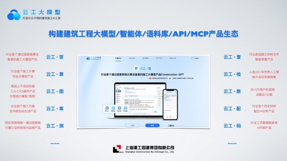 自2024年9月正式发布以来,“云工大模型”已上线包括首个施工大模型产品“云工·答”Construction-GPT在内的一系列行业首创大模型产品,深度赋能建筑工程应用场景,累计形成自主知识产权成果200余项,荣获科技奖励30余项,在填补行业空白的同时,助力上海建工四建集团有限公司成为行业首家通过国家级AI算法备案的建筑施工企业,打造AI时代下的建筑业新质生产力。