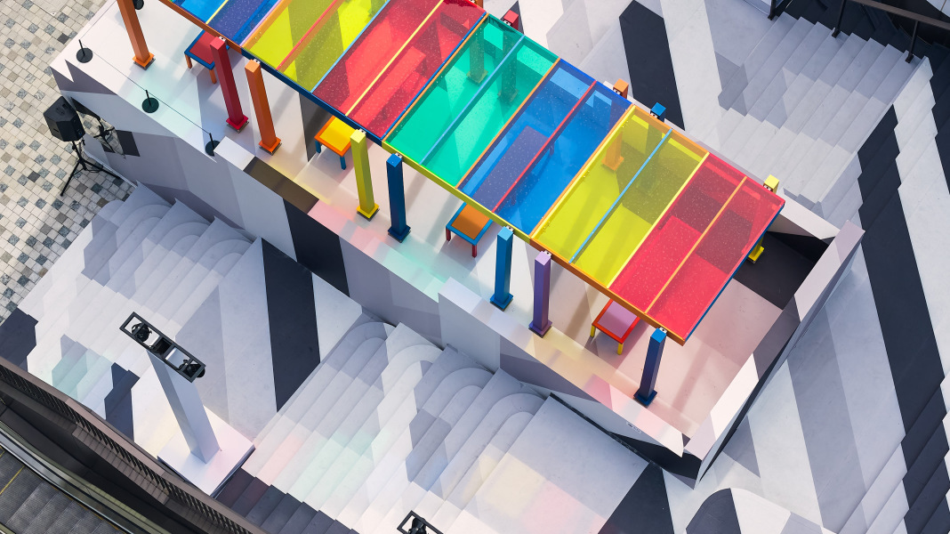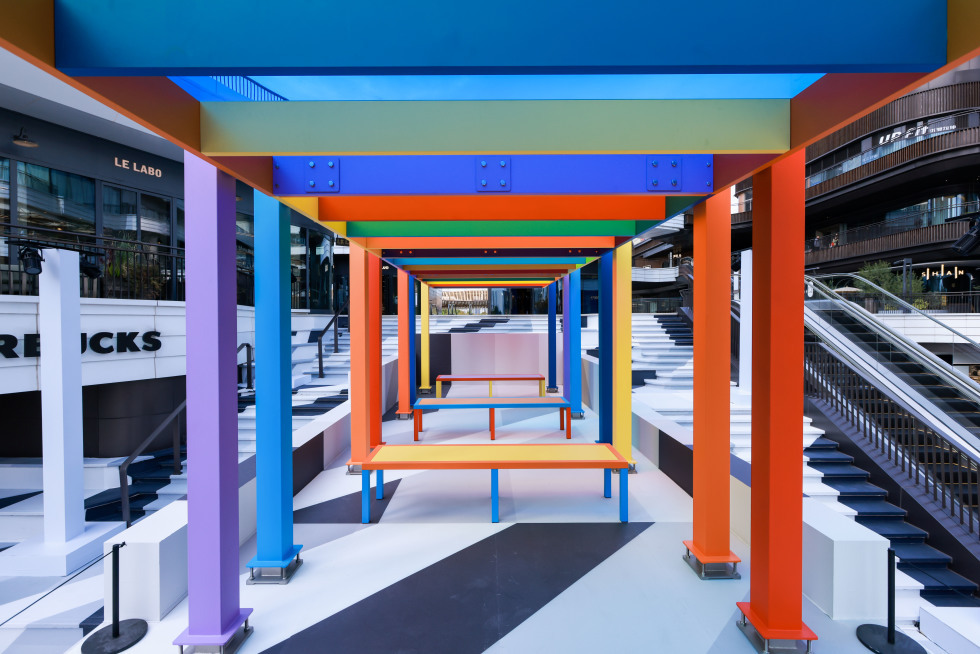 整个商场化身为一条流动的艺术动线。英国观念艺术家利亚姆·吉利克的《永续论台》亮相于中央公园东大台阶,作品由四个色彩缤纷的高架平台构成,顶部覆以彩色有机玻璃,并叠合于新作《原始山峰1号》之上。