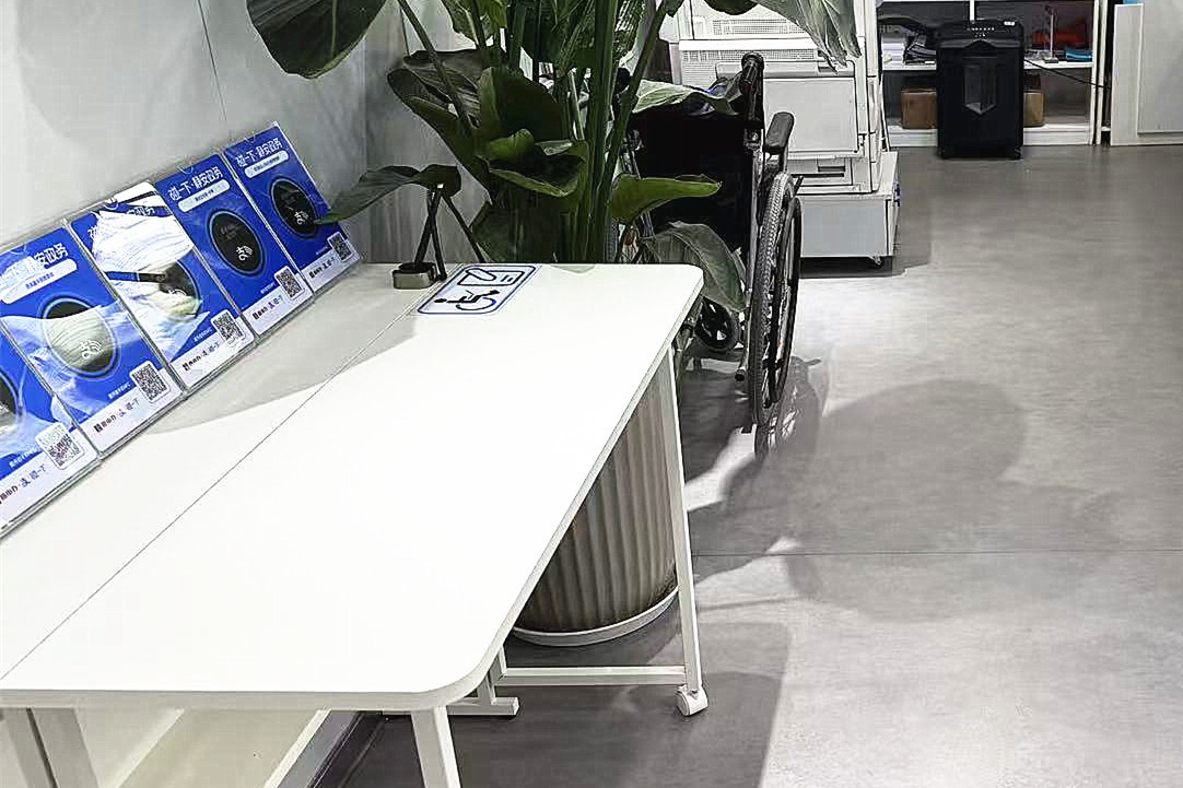记者从中心了解到,在2022年首次改造的基础上,中心进一步加强无障碍环境建设,包括加装照明设施、安装隔音棉、增设无障碍扶手等。新建的无障碍卫生间不仅配备防滑地砖、安全扶手,还增设应急呼叫系统及轮椅回转空间。所有无障碍坡道临空侧也加装了符合规范高度的连续式安全围栏,有效防止拐杖、轮椅小轮等意外滑出,消除通行安全隐患。中心还专门配备了低位服务台与留出宽敞空间的无障碍服务台,方便有需要的居民舒适书写。