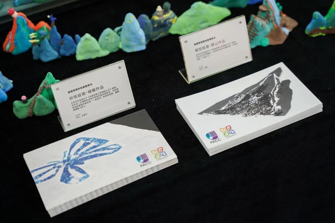 “这是我们的砂纸版画作品,课上,我们根据不同材料的纹路特征制版,勾勒出了蝴蝶的形态和花纹。”