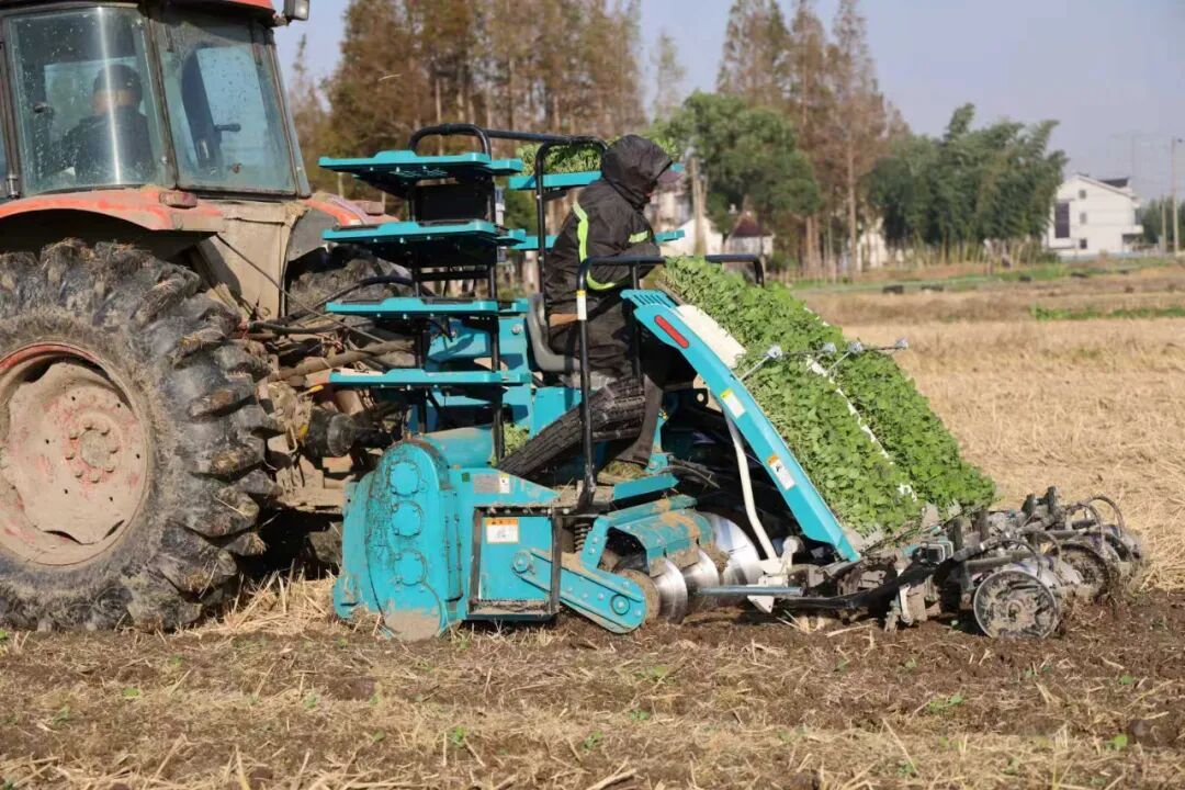 11月18日上午,枫泾镇新元村核心区块的400亩农田里,移栽机来回穿梭。嫩绿的油菜毯状苗从机器中稳稳滑落,钻入松软的泥土,不多时就铺满了田垄。这种“插秧式”油菜移栽技术,在上海地区尚属首次应用,以机械化替代传统人工,让油菜种植像插秧水稻般高效精准,成为破解“稻油争时”难题的关键突破。