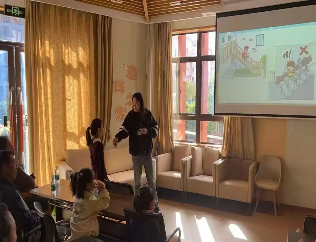 活动带领者首先通过一组精心准备的校园安全隐患图片,成功吸引了孩子们的注意力。活动带领者提问引导,“大家看看这张图片里,有哪些行为可能会让自己或同学受伤?”参与活动的孩子们积极响应,指出了在楼梯打闹、教室地面湿滑等危险场景的图片,现场气氛迅速活跃起来。
