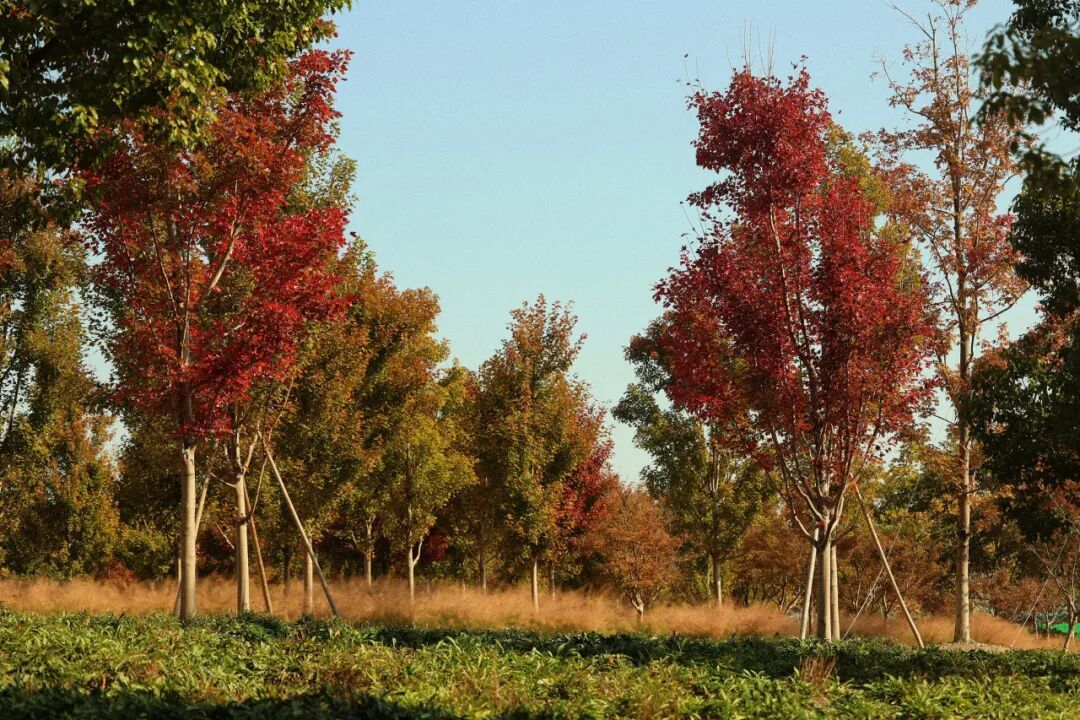 褐色韵律悄然吟唱,挺拔的树干与锈红的树叶,时光在此仿佛也慢了下来。