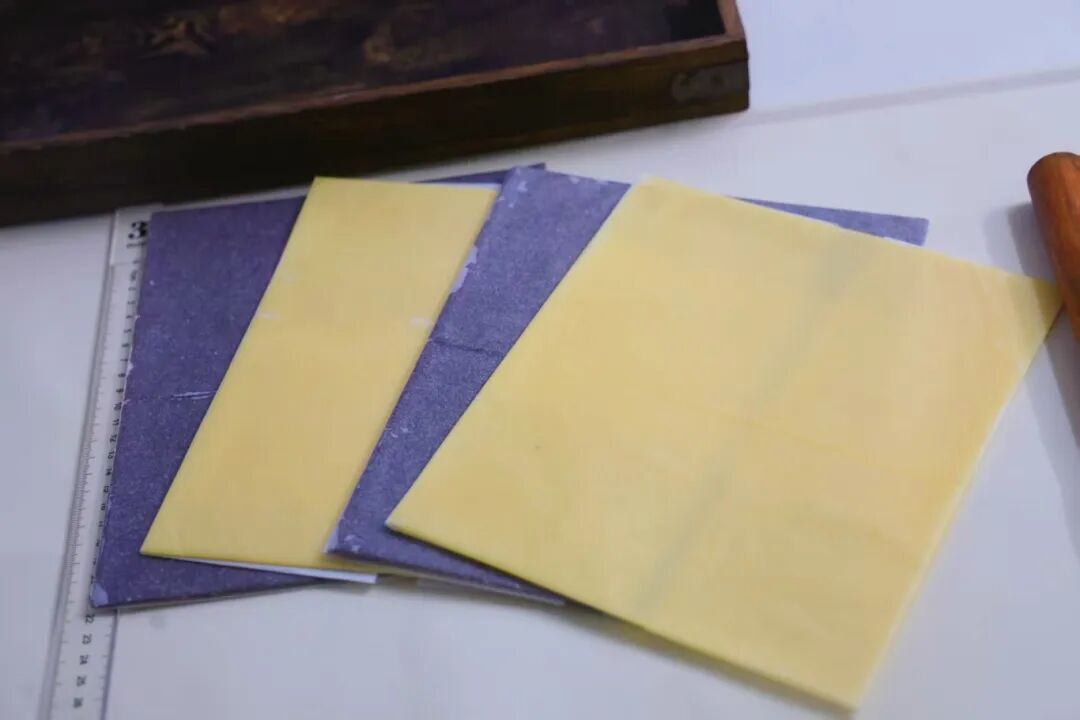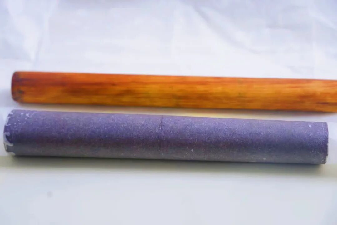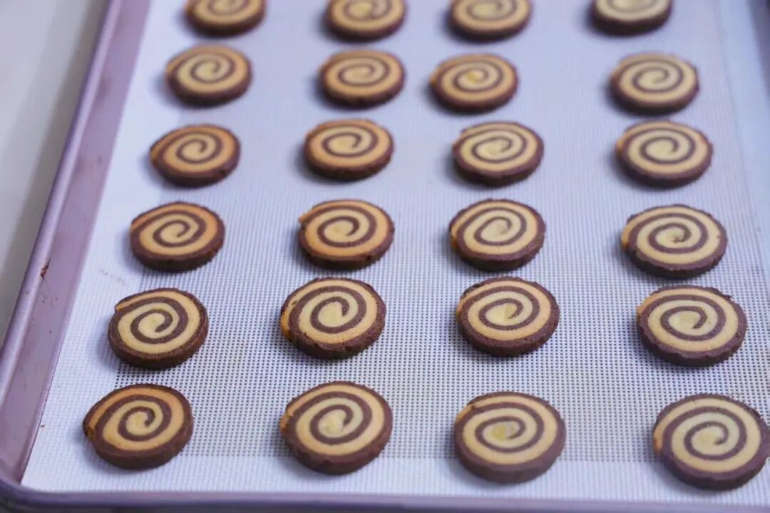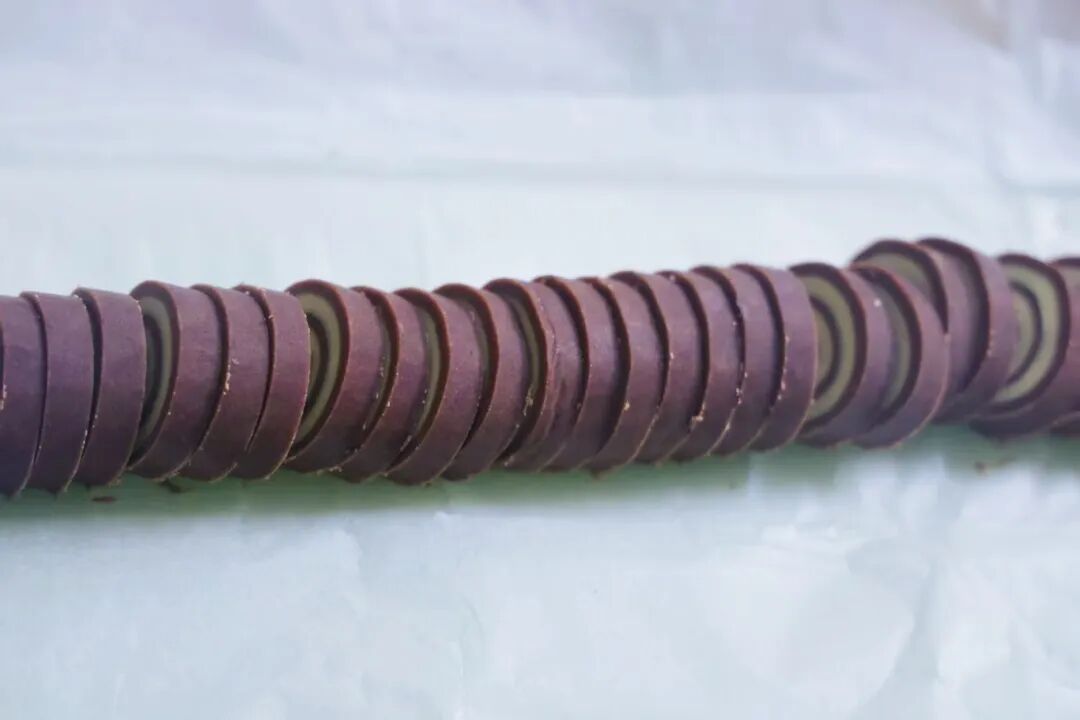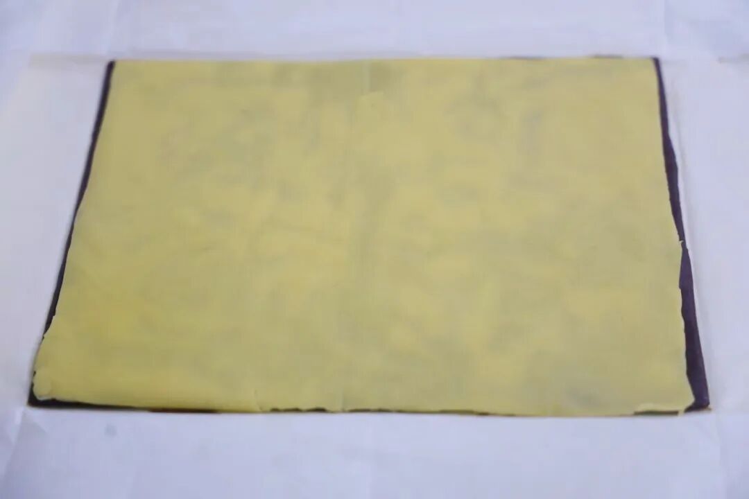 7.擀面杖擀开擀薄,原色擀成长宽24×20厘米;可可面团擀成长宽24.5×20厘米。