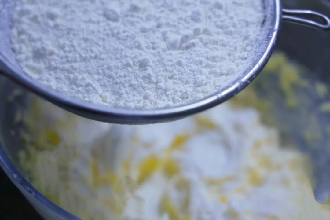 3.分两次加入全蛋液,低筋面粉过筛。