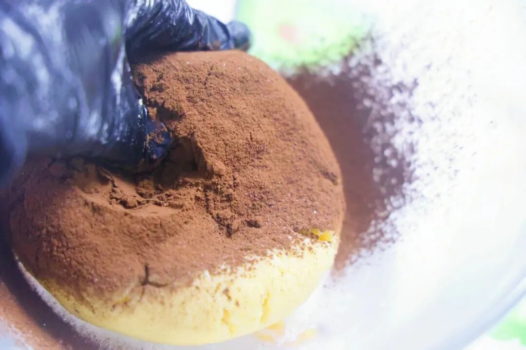 6.揉成可可面团分成两等份。